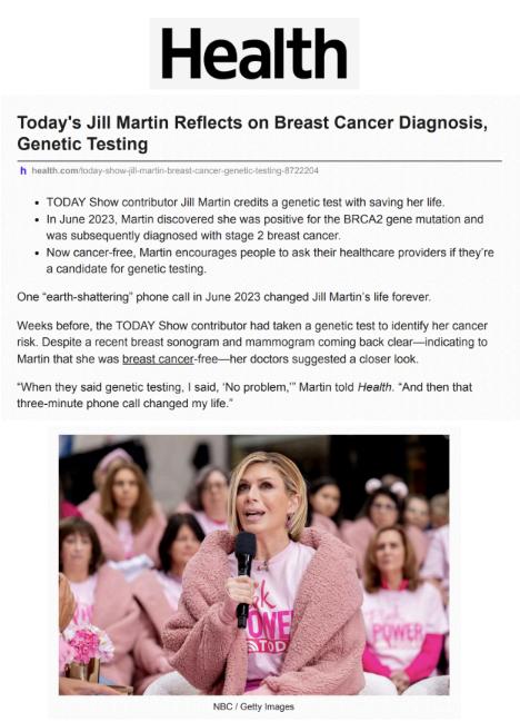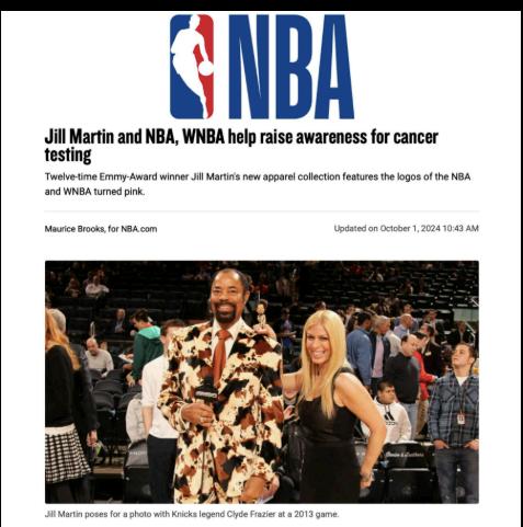 On October 1st, 2024, Jill launched a national campaign on the TODAY SHOW in collaboration with the NBA & WNBA With the help of her contact Chloe at the league, Jill was able to turn the NBA logoman, WNBA logo & other team logos pink to raise money for their respective charities. Thank you to the University of Michigan, Miami Heat, Cleveland Cavaliers & New York Knicks for participating in our 2024 campaign Because of our efforts, a huge donation is being made to BCA awareness and genetic testing - a test that saved Jill’s life.