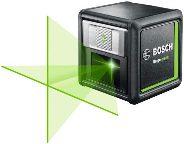 Laser frá Bosch með grænar láréttar og lóðréttar línur fyrir betri sýnileika. Festing með klemmu fylgir.