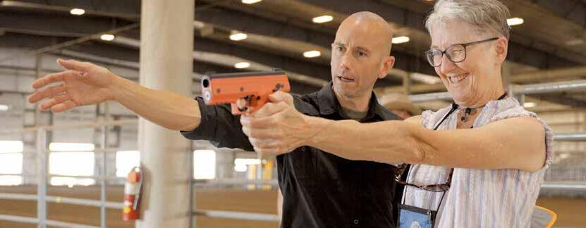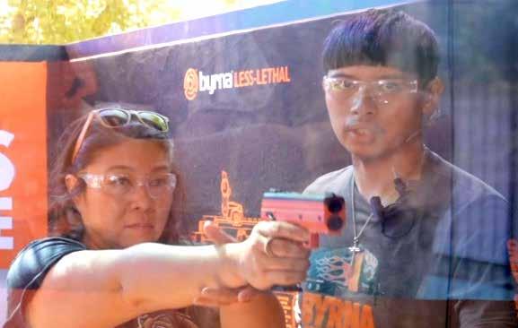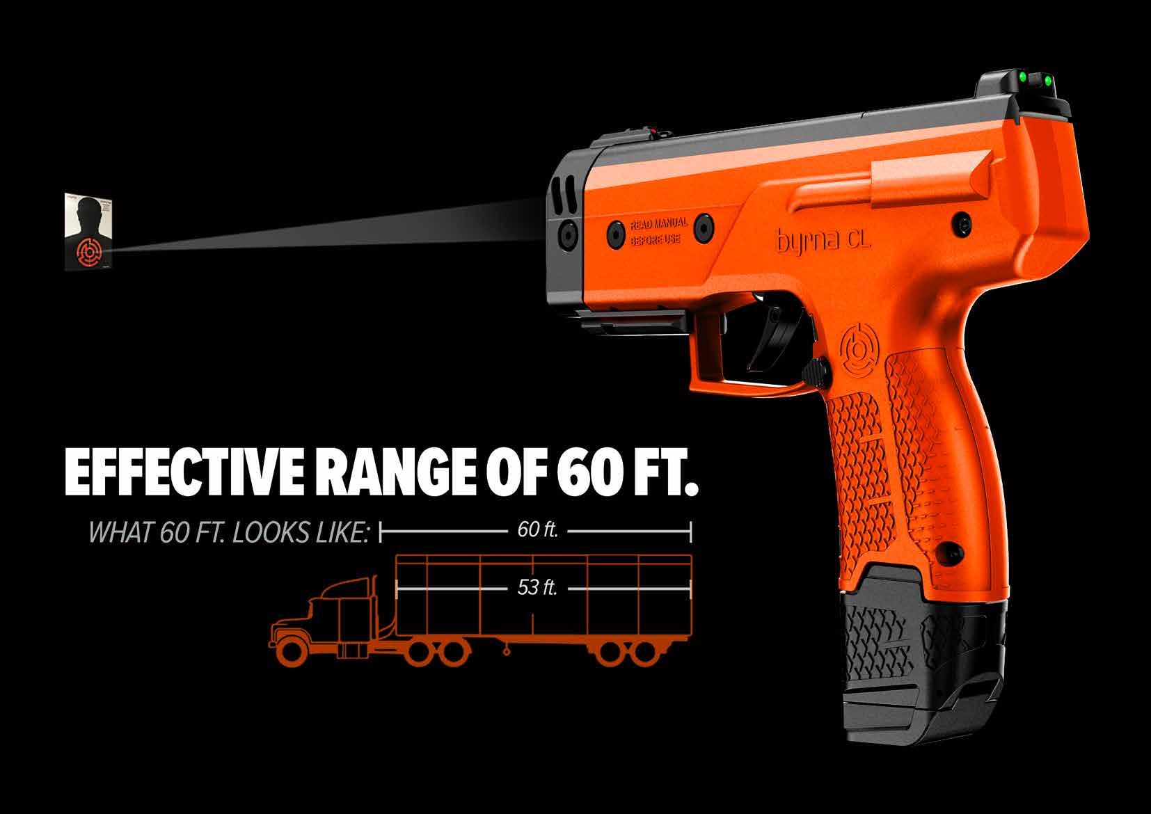 With batons and stun guns, you are in hand-to-hand combat before they are efective. Even with pepper spray or an electroshock device, you are range-limited to 10 to 15 feet. By then, the situation has escalated out of control. The Byrna SD and LE both have a 60’ efective range.