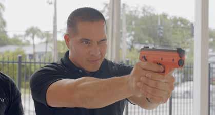 With batons and stun guns, you are in hand-to-hand combat before they are efective. Even with pepper spray or an electroshock device, you are range-limited to 10 to 15 feet. By then, the situation has escalated out of control. The Byrna SD and LE both have a 60’ efective range.