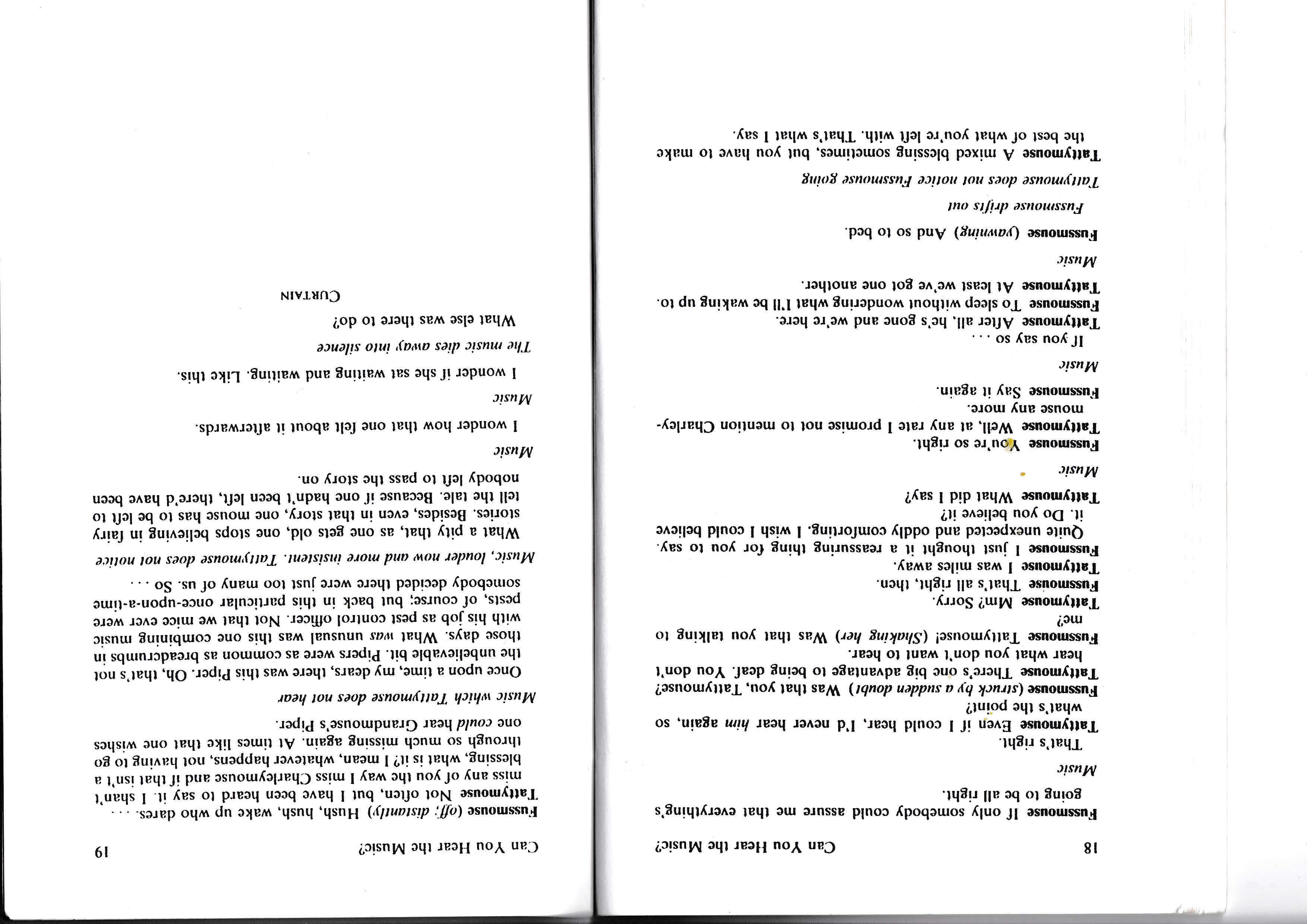 SARA: (On floor) Not now. I was at first, but now they’re a part of the story. There were always rats in prisons, and the prisoners tamed them with crumbs. That is how I tamed Melchisedek and his wife. (Calls rats) Come on, Melchy dear, come, nice Melchy.