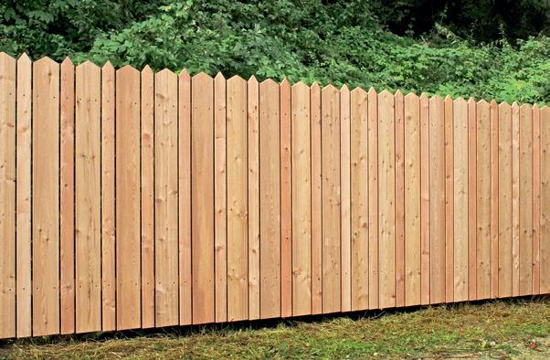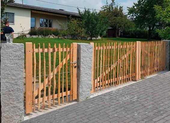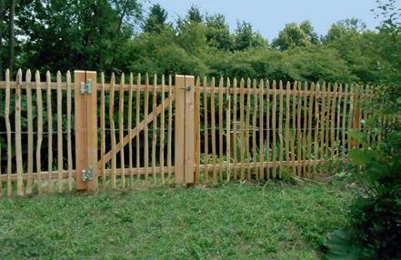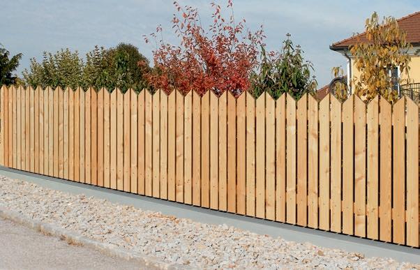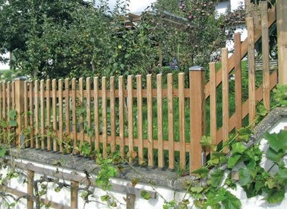 Für den oberen Abschluss sind viele Varianten möglich: nach vorne abgeschrägt, gespitzt oder mit Bogen. Der Brettabstand beträgt in der Regel 50 mm, kann aber auch geringer sein, sodass der Zaun als Sichtschutz dient.