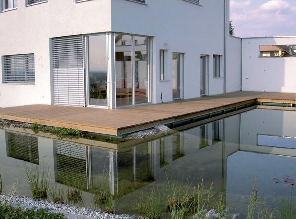 Immer beliebter werden Terrassenböden aus Holz, weil sie eine Überhitzung im Sommer verhindern. Als Hölzer werden zumeist Lärche und Thermo-Esche angeboten. Die Befestigung erfolgt mit Edelstahlschrauben in eine AluminiumUnterkonstruktion.