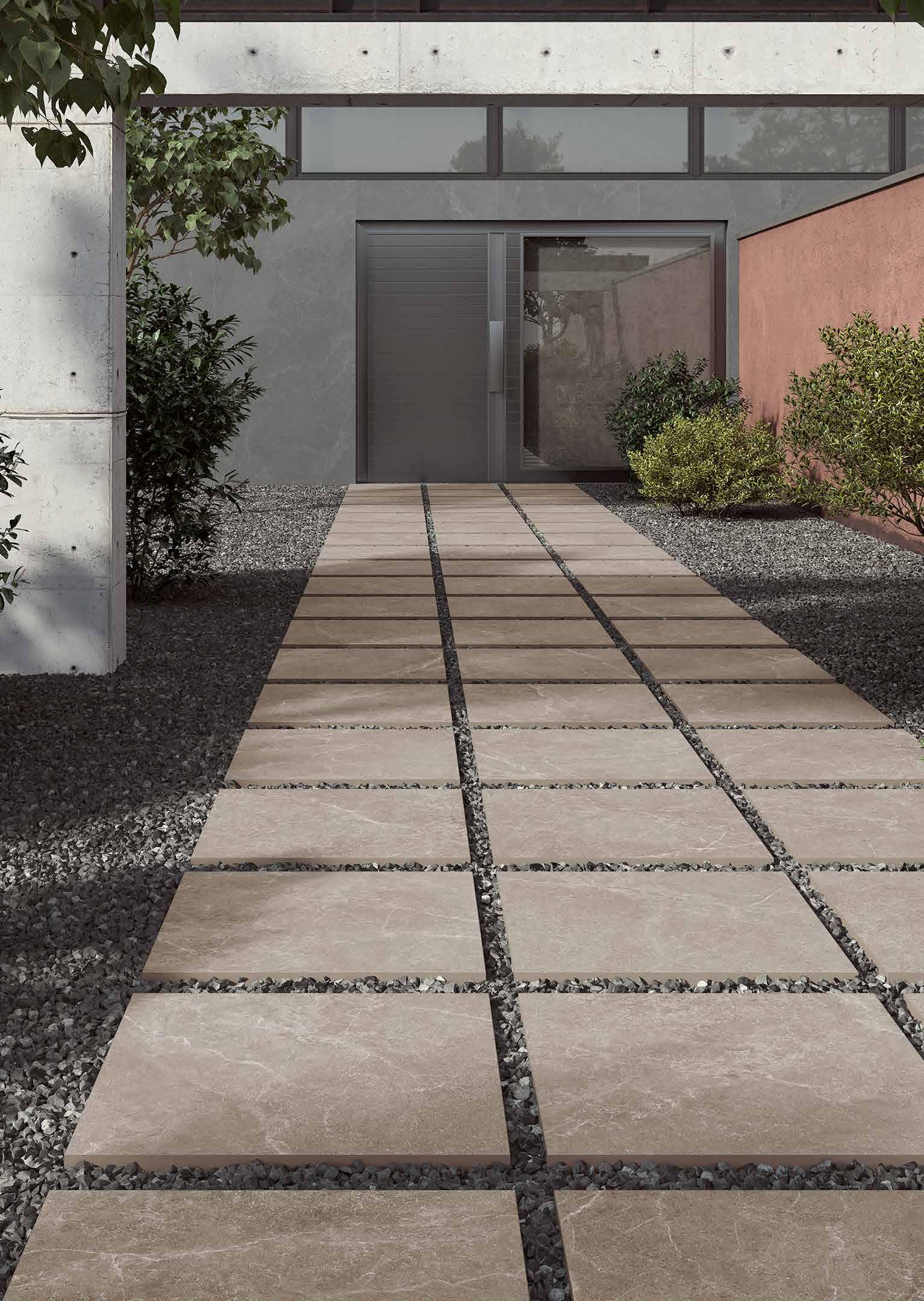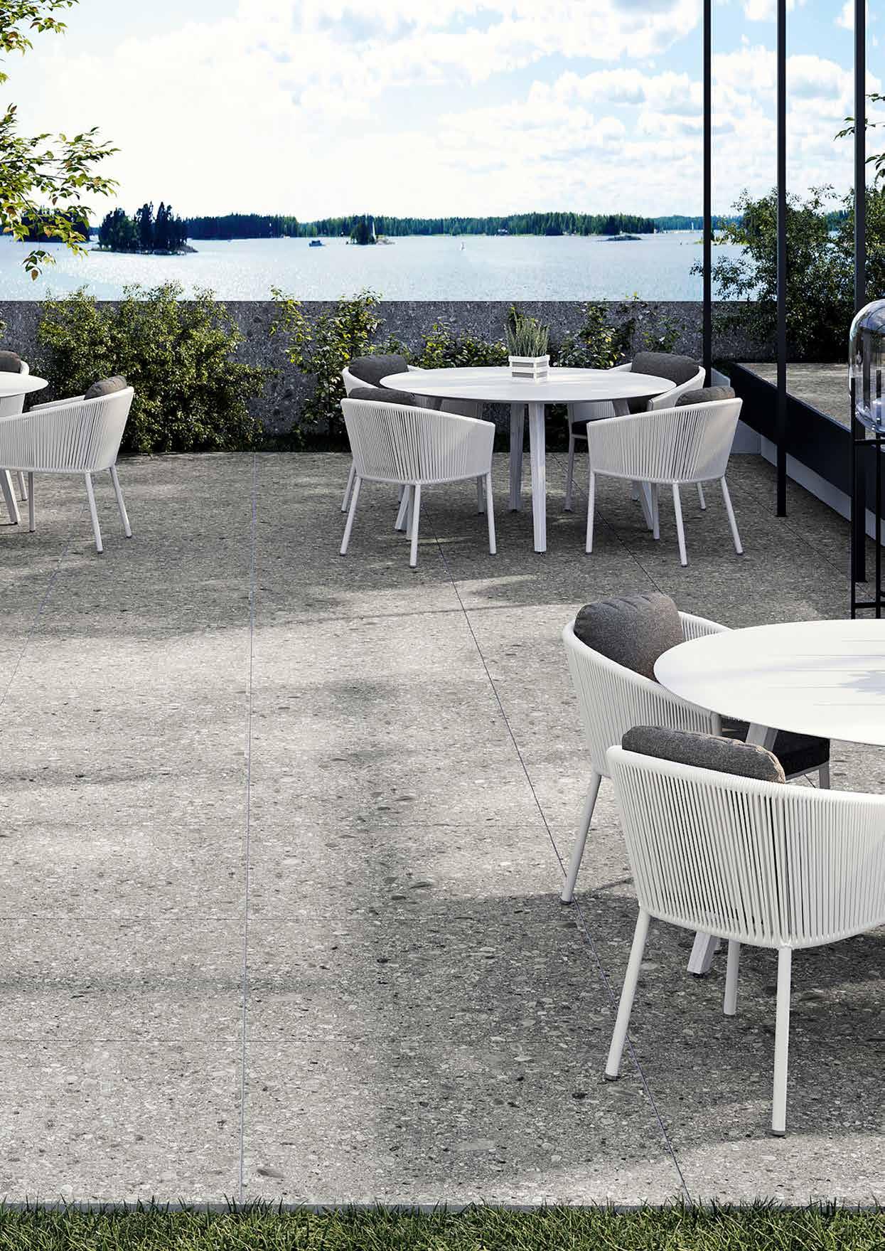Eine sinnvolle Mindestgröße der Keramik liegt bei 60 x 60 cm, welches in einen 4/8 mm eckigen Splitt verlegt wird Die Aufbauhöhe des Splittbettes muss mindestens 3 cm betragen Die Verdichtung des Kiesbettes erfolgt über die Feinsteinzeugplatten nur mit dem Gummihammer