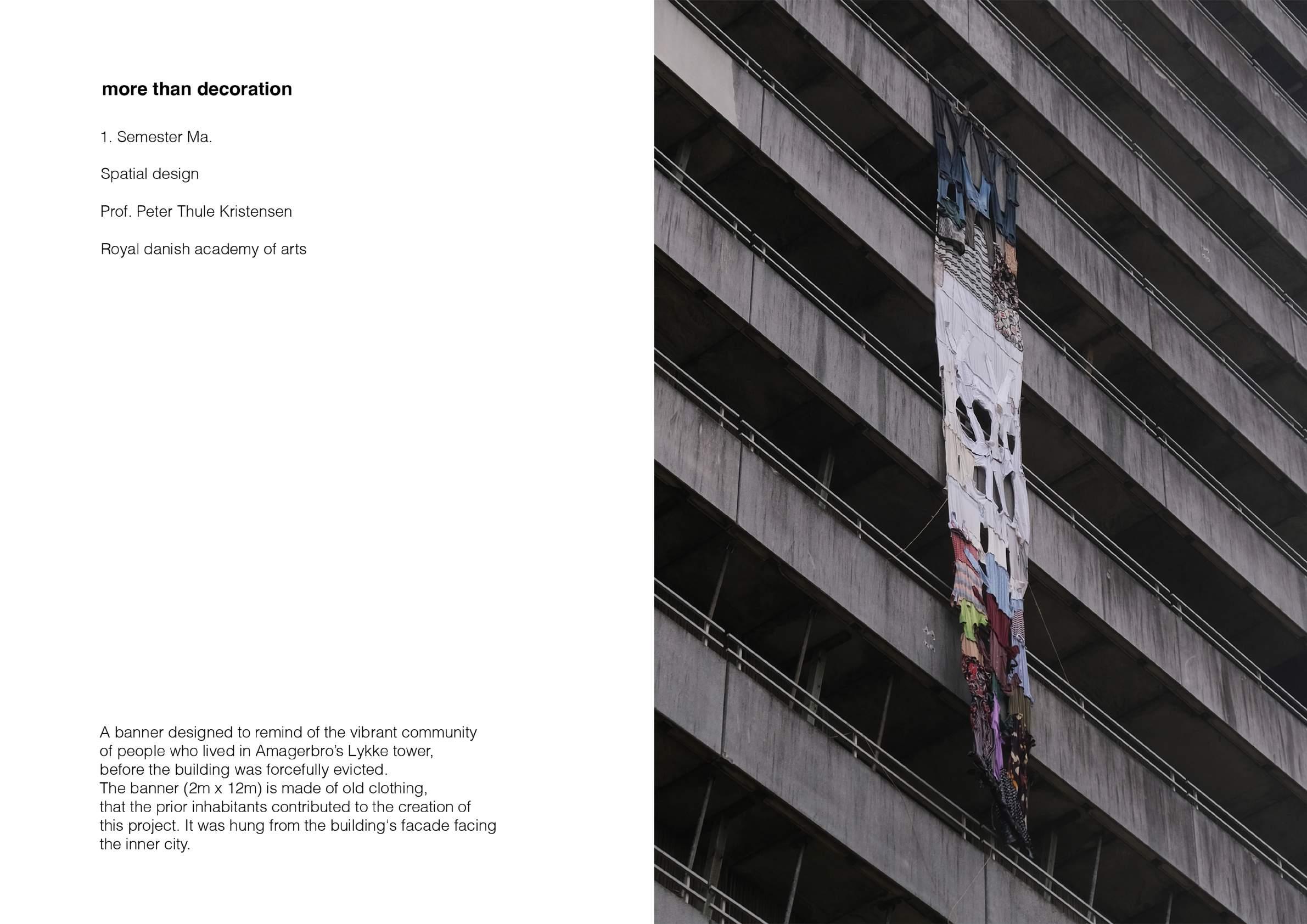 A banner designed to remind of the vibrant community of people who lived in Amagerbro’s Lykke tower before the building was forcefully evicted. The banner (2m x 12m) is made of old clothing, that the prior inhabitants contributed to the creation of this project. It was hung from the building facade facing the inner city.