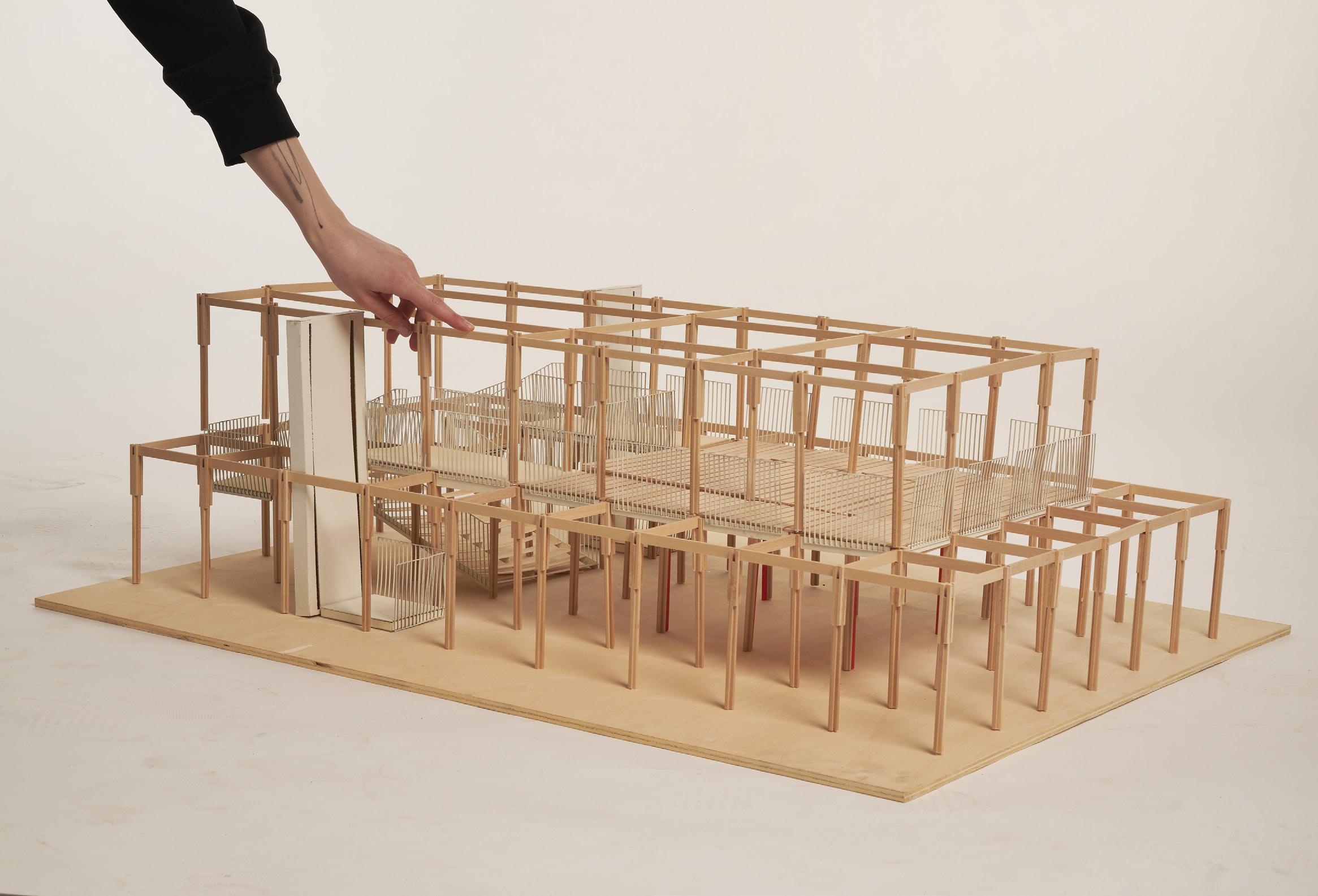 A wooden model in the scale of 1:20 was used to explore the configuration of the structural system we were proposing. It became an integral tool for the mediation of the project.