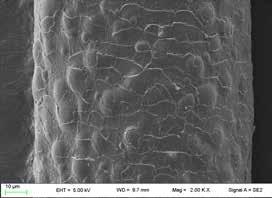 Untreated hair appears dehydrated with presence of unidentified material deposited between the cuticles with jagged and irregular shapes.