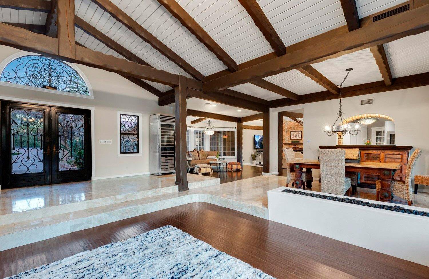 nature with treetops and mountain views. Designed to lean towards a more modern theme, the homes ceilings vary from 18’+ ceilings to 12’ with multiple sliders for indoor outdoor living. The