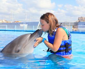 • Besos y abrazos con el delfín en una plataforma poco profunda