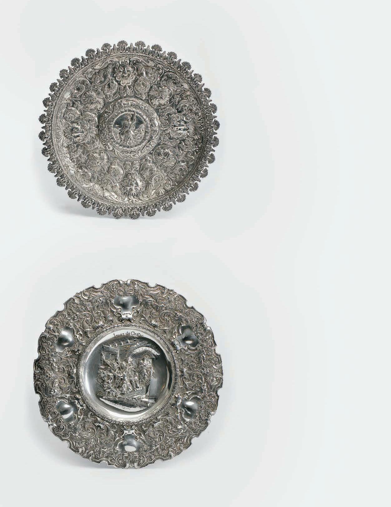 a Ceremonial salver Baroque style, silver, repousée and chiseled decoration “Grotesque masks, dolphins and flowers”, centre with relifed medallion “Nobleman”, scalloped edge, Spanish or Colonial Spanish, 19th C., 19th C. (2nd half), signs of use, without marks, pursuant to Decreto-Lei no. 120/2017, of 15 September - art. 2, no. 2, subparagraph c)