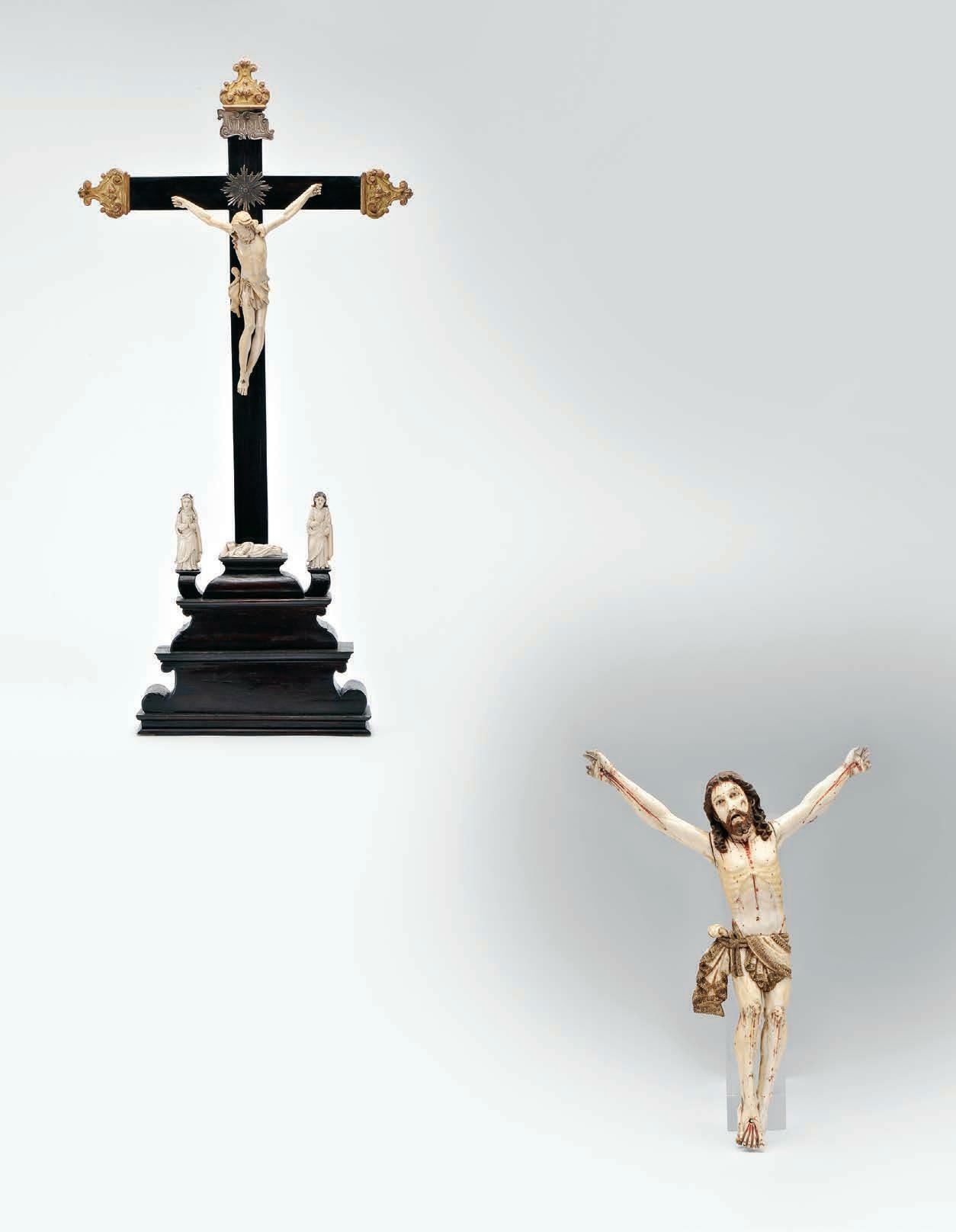an altar “stool” CruCifix 833/1000 silver, chiseled decoration en relief “Instruments of the Passion and plant motifs”, «claw-and-ball» feet, halo set with red glass, Portuguese, 19th C. (2nd half), signs of use, small bruises, candlestick base filled with wood, candlestick with assay mark from Oporto (1877-1881) and maker’s mark attributable to Joaquim Gonçalves Taveira de Azevedo, all parts remarked with Cabeça de Velho
