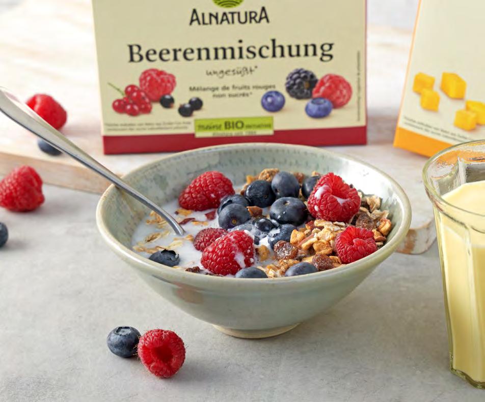 Un petit mélange fruité bio que tout le monde aime ! Normal, le rouge est la couleur de l’amour. Dans ce mélange, Alnatura réunit la douceur et l’intensité de différentes baies, cultivées dans le respect de la nature. Idéal pour vos mueslis, yaourts ou simplement à grignoter. Se décongèle rapidement. Les Beerenmischung en paquet de 300 g, sont à 2,85 €