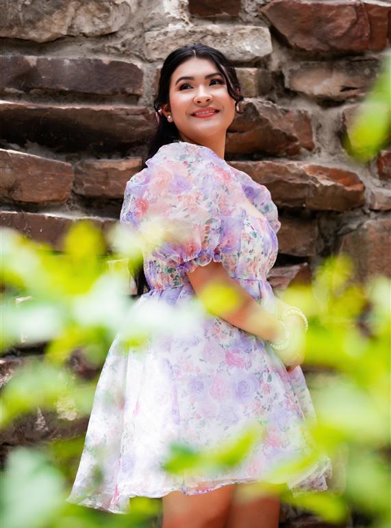 Phoebe chose just the right scene to highlight this student's BTS prop and dress. Both the student and her bouquet are popping!