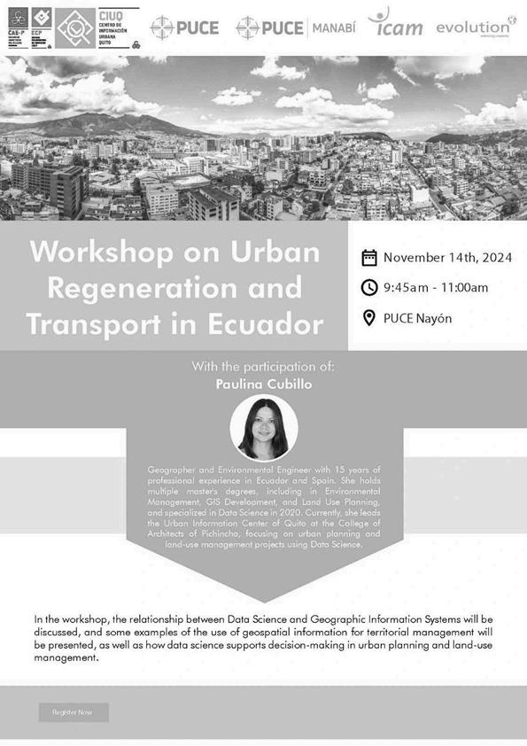 La Universidad Católica del Ecuador a través de la Facultad Internacional de Innovación ICAM, organizó la mesa de trabajo denominada “Workshop on Urban Regeneration and Transport in Ecuador” , en la que CIUQ fue invitado a participar con la charla “Data Science and Geographic Information Systems for Urban Generation”, evento que contó con la participación de estudiantes de la carrera de Ingeniería Integral provenientes de Alemania, Italia, Ecuador y Estados Unidos.