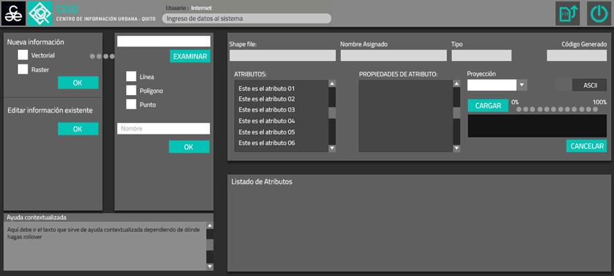 ●Módulo de edición de mapas on line. Este es un complejo módulo que implica la subida de mapas, la configuración inicial y la posibilidad de edición de los mapas para corrección de errores menores. Una vez terminado el sistema funcionará en modo Off Line desde computadores de escritorio aunque se requerirá de conexión a internet para la interacción con el servidor del Geo CIUQ. Actualmente se encuentra en fase de diseño de interfaz. A continuación ponemos algunos ejemplos del diseño ya que son demasiadas pantallas para poner el diseño completo