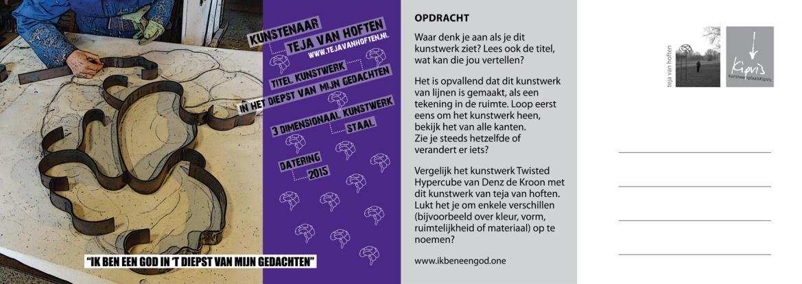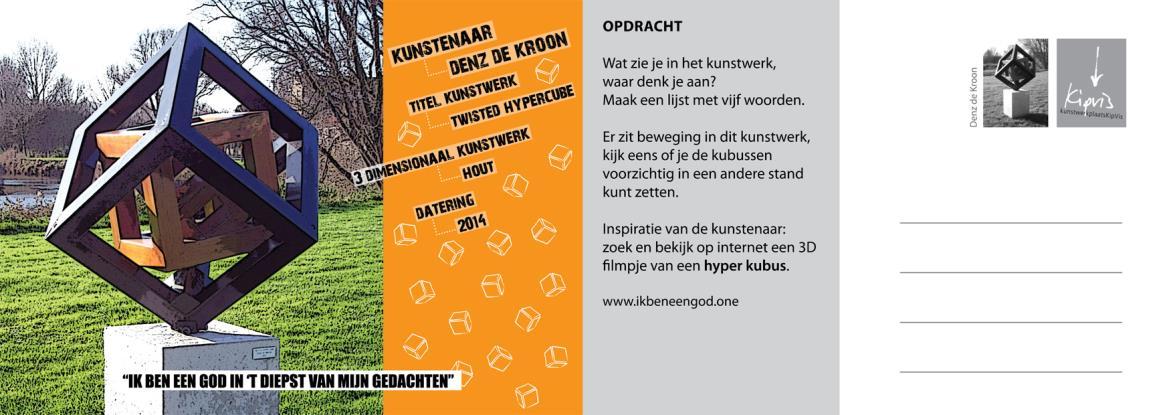 Een aantal kunstenaars van de kunstwerkplaats KipVis hebben de mogelijkheid gekregen werkzaam te zijn in de wijk Paauwenburg (hoek Gerbrandystraat/Sloeweg). Zij willen er zichtbaar zijn door een bijdrage te leveren aan het welzijn in de wijk. Het project heeft de naam van de beroemdste dichtregel van Willem Kloos uit zijn sonnet dat je hiervoor las: Ik ben een God in ’t diepst van mijn gedachten.