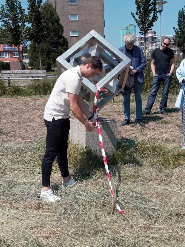 heringebruikname van het gerestaureerde beeld Hypercube van Denz de Kroon