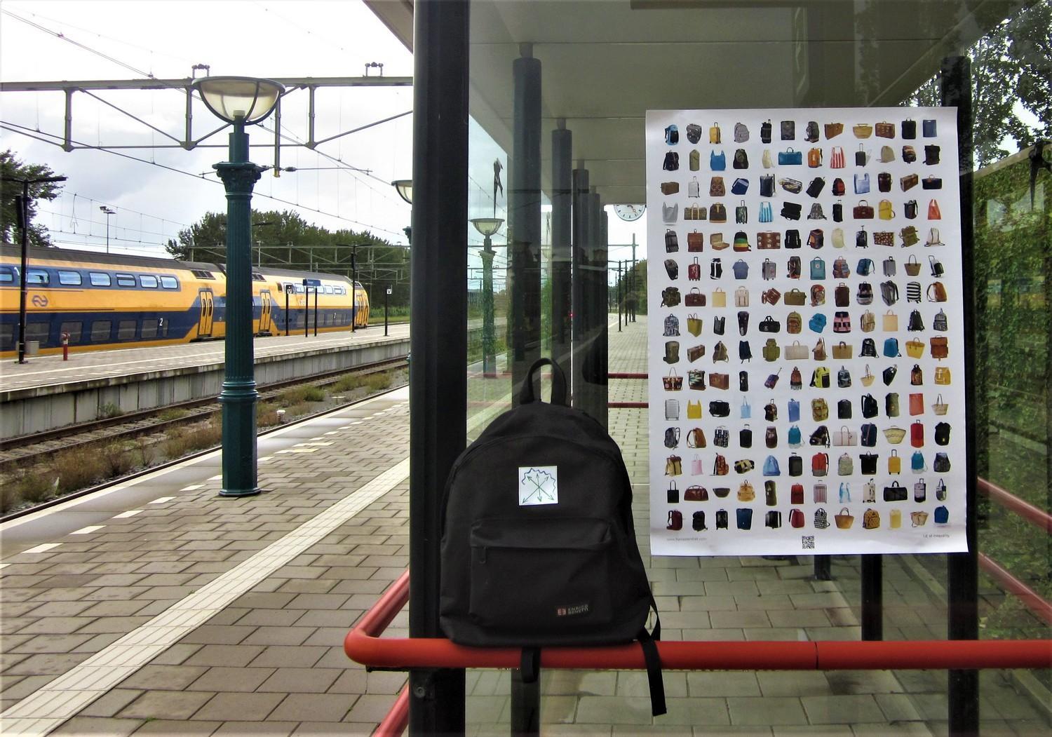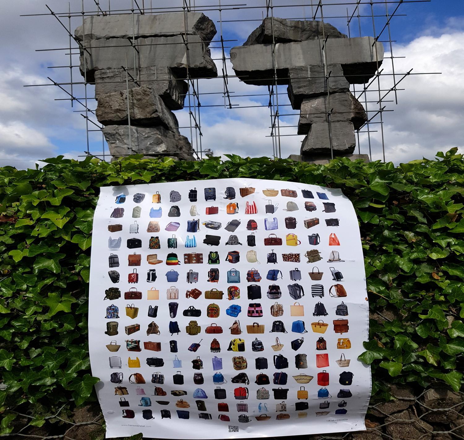 Den herzlichen Empfang, den die westlichen Menschen überall erwarten können, gibt es für sie nicht. Keine Infrastruktur, in der sie sich sicher fühlen, keine Steuervorteile, sondern unzählige Gefahren, Nöte und hoffnungslose Zugangskriterien. Ihre Mobilität ist so weit wie möglich eingeschränkt und wird uns im Sinne eines „Empfangs in der Region“ verkauft. Derweil drückt sich die Realität in erniedrigenden Flüchtlingslagern aus. Kurz gesagt, Mobilität ist derzeit eines der deutlichsten Beispiele für Privilegien. Das Poster zeigt jedoch eine der wenigen Ähnlichkeiten zwischen diesen verschiedenen Reisenden, nämlich ihr Gepäck. Der entscheiden-de Unterschied besteht im Inhalt dieser Koffer, Taschen und Ruck-säcke.