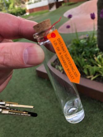 Back to the beautiful conversations during the melting. My art work i.d. of a shared bullet consists of a frozen ice bullet in a small bottle provided with a cork and a label carrying the title. The bullet is from an AK-47 Kalashnikov. of
