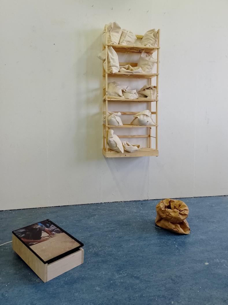 Work DISTANT SUFFERING LVI | i.d. of shared betrayal cotton pouches with bullet holes caused by air pistol Webly Tempest 4,5 mm, nr. 221796, Webly&Scott LTD; Shagai Parboil rice, mixed with Riz noir interdit, Maison Sabarot; video, courtesy by ©Myuz Ahmed, July 27, 2025, Gaza Strip; sound of an Israelian drone; 24” TV- Samsung LF22T450FQUX | Speedlink BRIO - Stereo Soundbar; brown paper bag from bakehouse ’t Zand, Middelburg; Monzana Storage Rack Bookcase, 5 Shelves, 135,5 x 58 x 27 cm;
