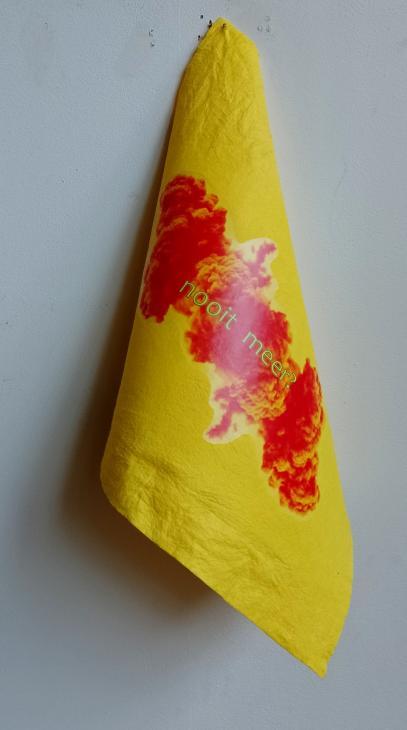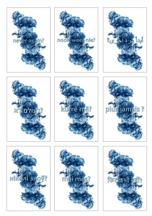 pakje kunst | 20 photo prints 6 x 9 cm on 5 mm foam of a double explosion with the text ânever again?â in 20 languages from around the world.