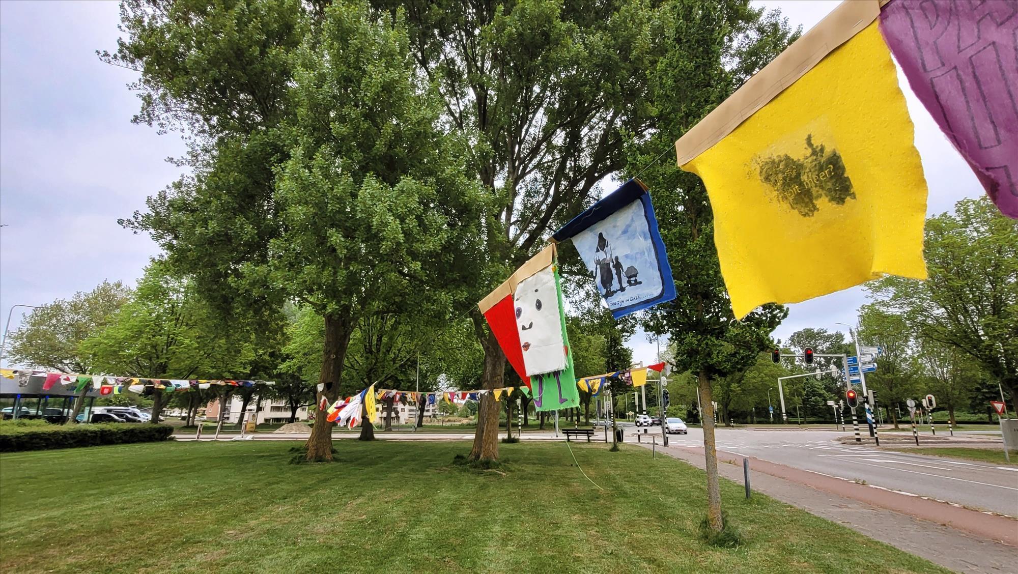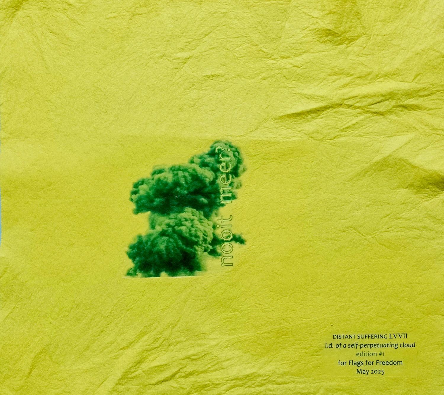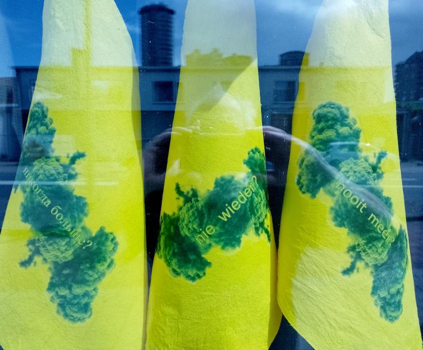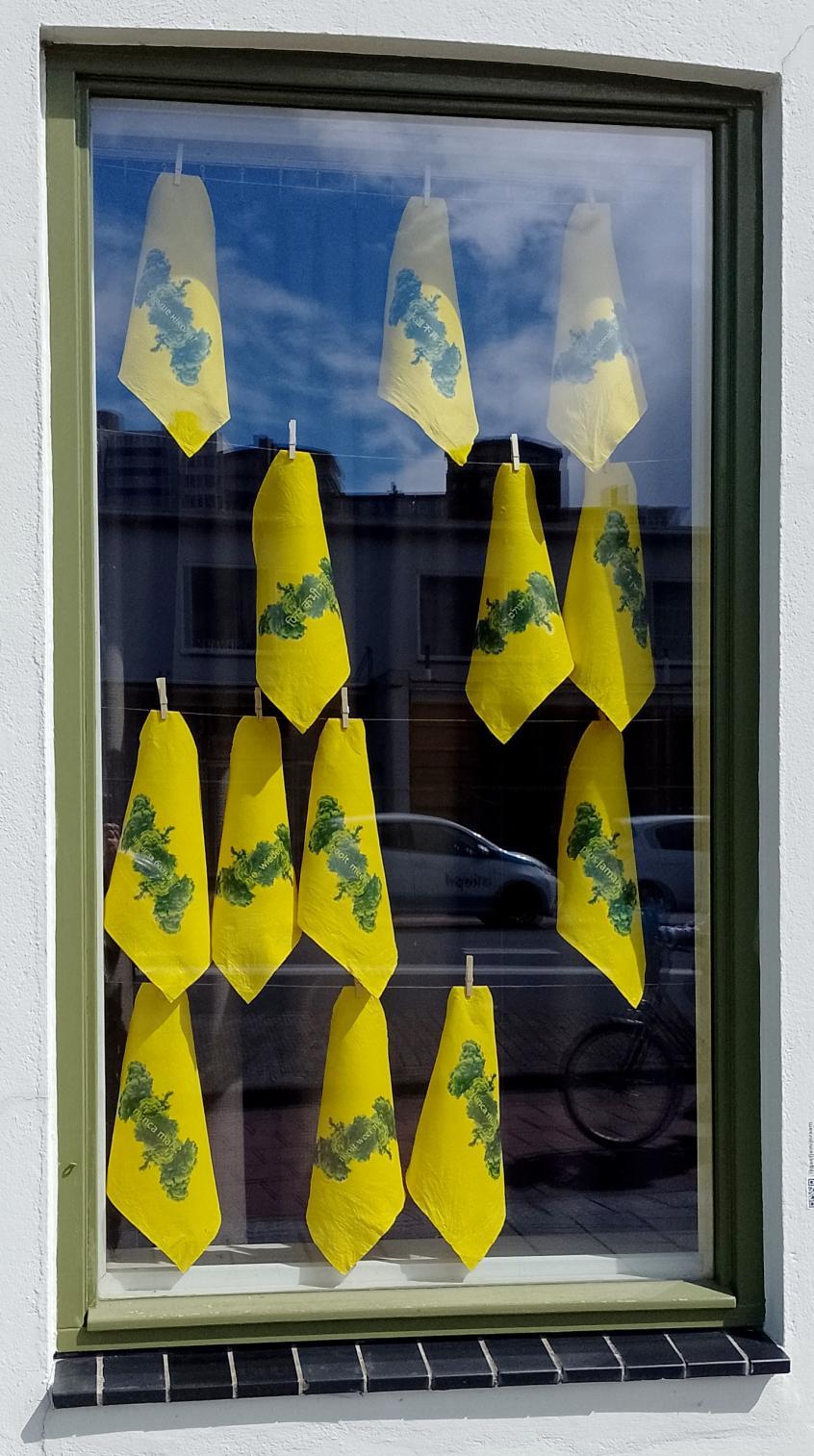 For the project FLAGS FOR FREEDOM, held on the lawn in front of the art workplace Kipvis in Vissingen on March 3, 2025, I used nine yellow cleaning cloths as a backdrop for a cloud / explosion with the words ‘never again?’ written across it in nine different languages.