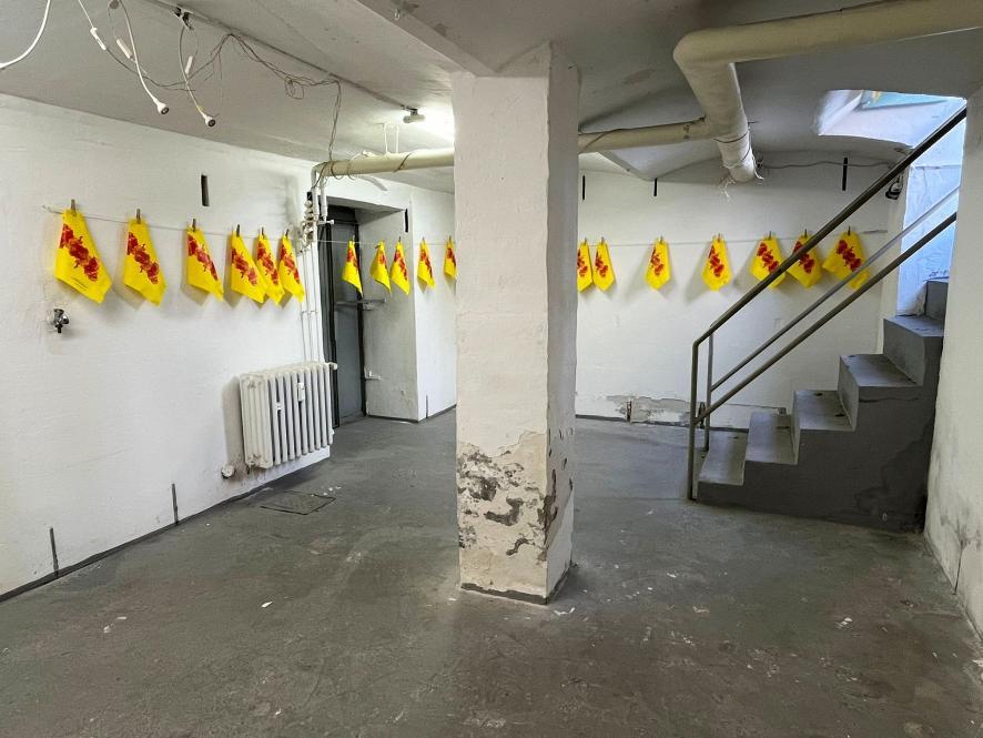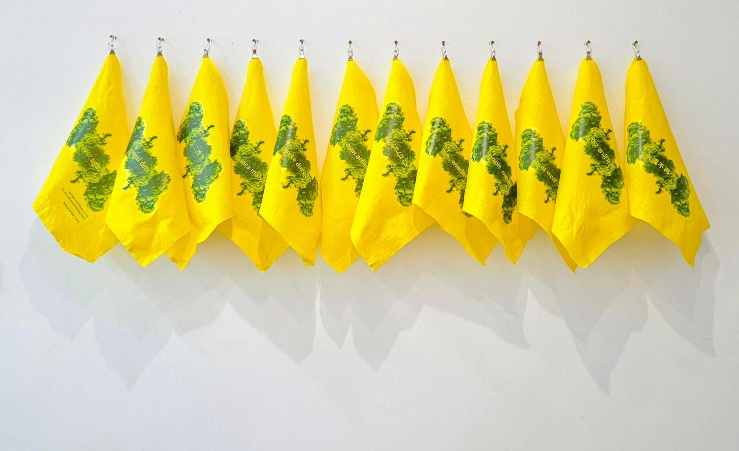 drying rack with five yellow cleaning wipes with four languages edition #7 proposal for the 16th OSTRALE Biennale