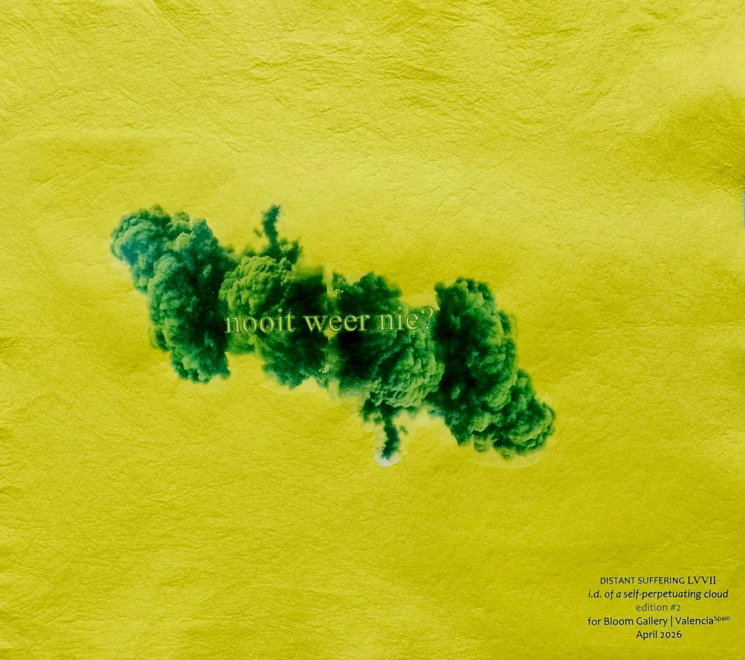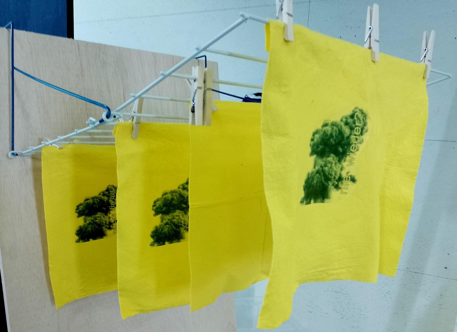 Doubled cloud / explosion; 13 texts in Candara, varying languges, varying font; 13 textile transfers for inkjet, A4, Quantore; one question: ‘never again?’; 13 viscose cloths Albert Heijn, yellow,38 x 40 cm; 13 wooden clothes pegs Albert Heijn; 0.8 mm copper wire; Inkjetprinter Canon TS 700 | Ink: 123inkt.nl, CU-581C XXL.