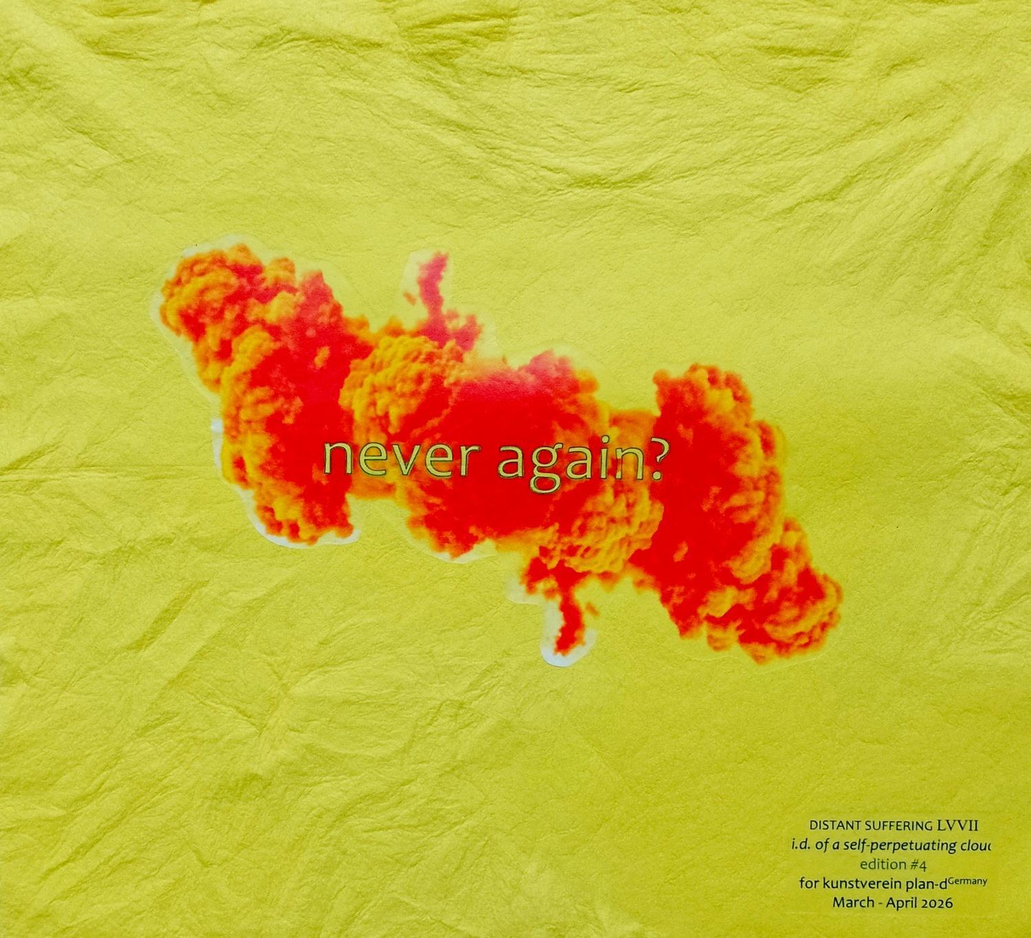 20 photo prints on 300 grs plane on 5 mm foam of a double explosion with the text ‘never again?’ in 20 languages and dialects. Next page: actual size of the works.