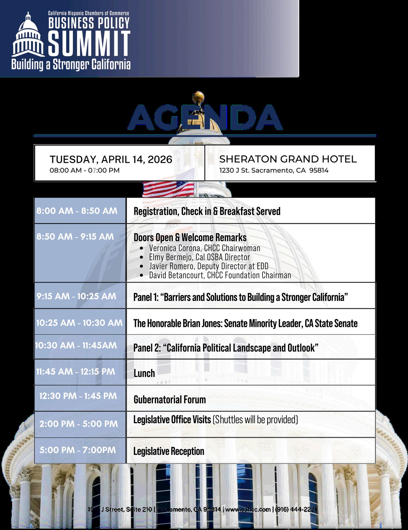 On behalf of the California Hispanic Chambers of Commerce, we would like to welcome you to Sacramento for the CHCC Annual Business Public Policy Summit. Since 1995, the CHCC has convened emerging entrepreneurs and small diverse business owners to advocate for our respective communities, but more importantly, to learn and understand the issues and the impact of potential legislative policies and political dynamics on the growth of California’s economy and our perspective communities.