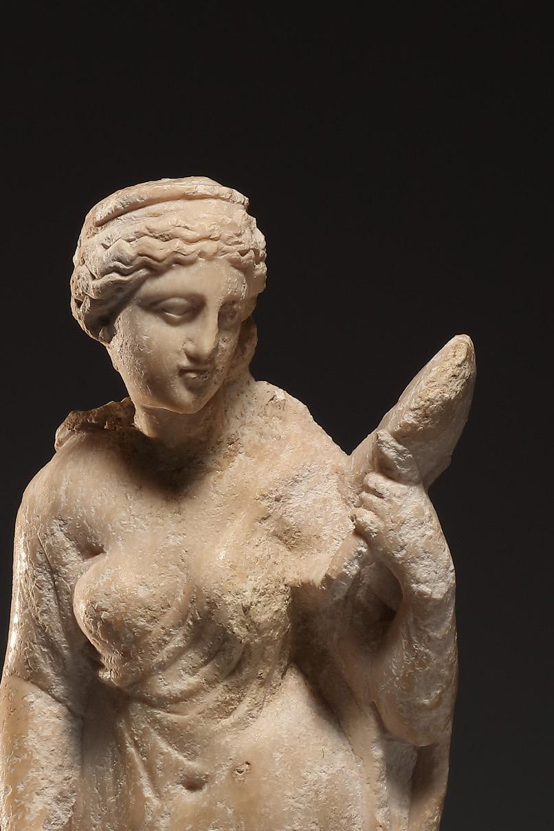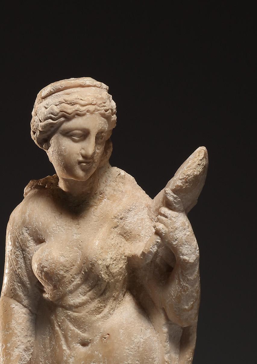 The goddess stands frontally, her left elbow resting on a partly fluted column. She holds a corner of her cloak, which is draped around her elbow and back, in her raised hand. The other end rests loosely on the thigh of her relaxed left leg. She grasps the folded edge of the cloak with her lowered right hand. The hair is combed backwards from the temples and tied together at the nape of the neck, forming a bow. Two thick spiral curls rest on her shoulders. The goddess wears a wreath with three inserted flowers and disc earrings. A long necklace with a bulla hangs around her neck, passing between her breasts and reaching down to her navel. The figure is modelled in the round. The back of the head is modelled in detail whilst the back of the body is treated in a cursory manner. A leaf-shaped firing hole on the reverse. The high rectangular base with rims is open at the base. Statuettes measuring 50 cm and above are exceedingly rare, due to their particular fragility. Reassembled; few small restorations. The layer of engobe is largely preserved but is partially sintered and has partially flaked off. Remains of polychromy, mostly discoloured; a pink band below the chest.