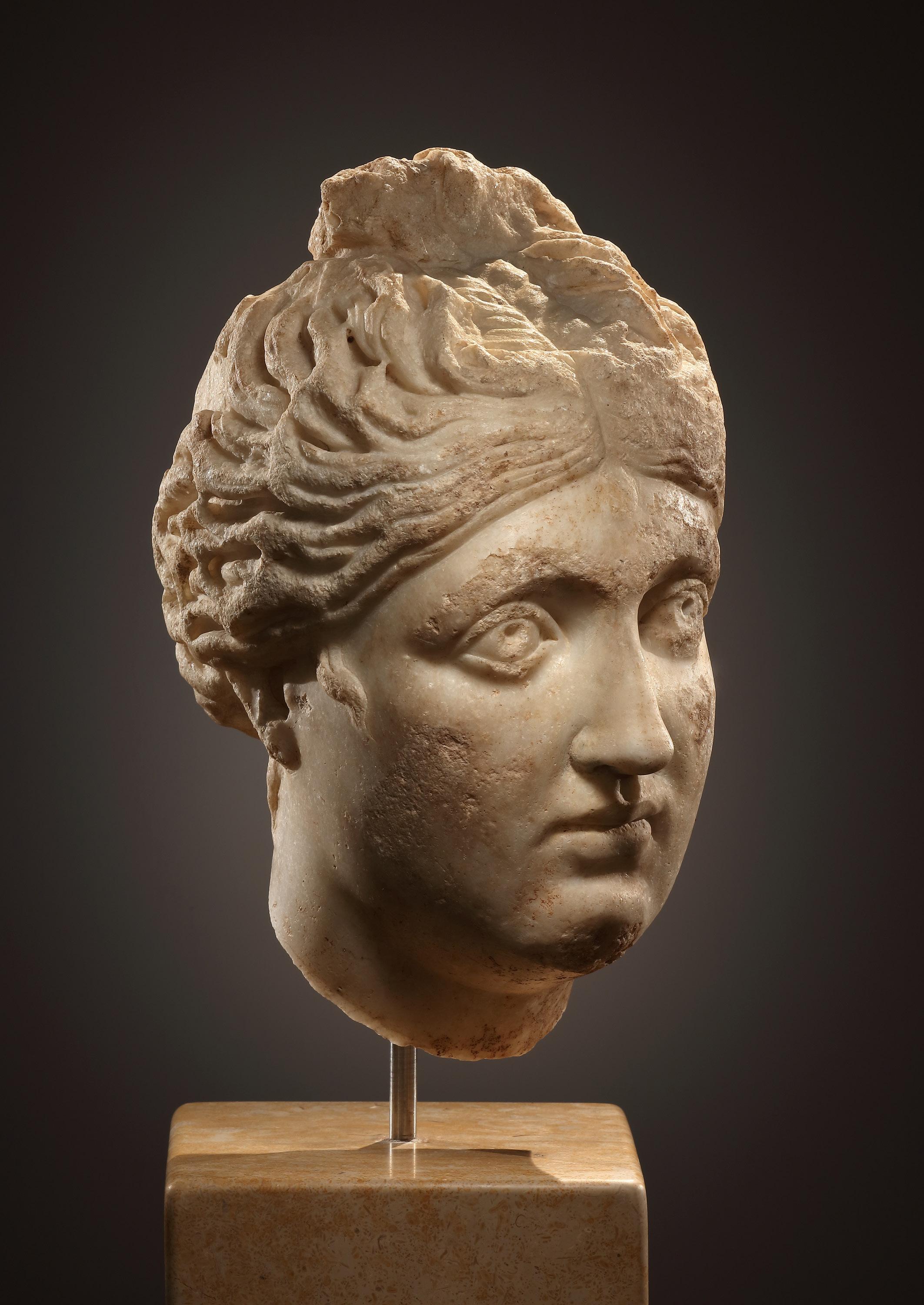 On the portrait and portrait types of Faustina Maior, cf. M. Wegner, Das römische Herrscherbild. Die Herrscherbildnisse in antoninischer Zeit (Berlin 1939) 26-32, pls. 10-13; K. Fittschen - P. Zanker, Katalog der römischen Porträts in den Capitolinischen Museen und den anderen kommunalen Sammlungen der Stadt Rom 3. Kaiserinnen- und Prinzessinnenbildnisse (Mainz 1983) cat. nos. 13-18. On the depiction of the empress in the guise of a goddess, cf. K. Maciver, Empress and Goddess: Julio-Claudian Women in the Imperial Cult (Diss. Hamilton 2001); A. Alexandridis, Die Frauen des römischen Kaiserhauses. Eine Untersuchung ihrer bildlichen Darstellungen von Livia bis Iulia Domna (Mainz 2004) 82-92; two replica portrait heads (cat. nos. 147-148, pl. 31, 3-4), which Alexandridis associates with Iulia Titi, show the sitter with a hairstyle typical of Venus, as is the case with to our portrait head. According to Alexandridis, however, approximations to Venus are also encountered in private portraits from the Flavian period onwards at the latest. For further examples of Roman Empresses represented as goddess cf. (cf. Livia as Ceres, as a life-size marble statue in the Louvre, Paris, inv. no. MR 259; depictions of Faustina Maior with cornucopia on the so-called Parthian monument from Ephesus, Kunsthistor. Mus. Vienna, Inv. I 1656 and as a marble statue in the Capitoline Museum Rome, inv. no. 48; a bronze statuette of Isis-Aphrodite with portrait features in the Metropolitan Museum of Art, New York, inv. no. 46.2.2, for which an identification as Faustina Minor has been suggested; a group of statues of Faustina Minor and Marcus Aurelius as Aphrodite and Mars, Capitoline Museums Rome, inv. no. 652.