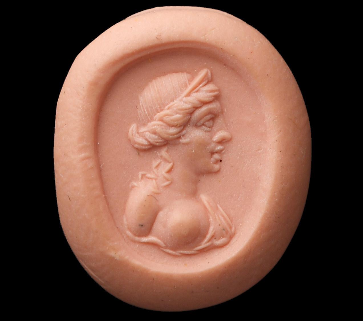 Upright oval gemstone engraved with the bust of a woman facing left. Her diadem and the garment slipping from her left shoulder, thereby exposing the left breast, allow a secure identification as Aphrodite/Venus. The motif, unquestionably imbued with erotic connotations, derives from the Aphrodite Fréjus type. The hairstyle recurs, in combination with the diadem, in the so-called Venus of Capua: the long hair is swept sideways over a fillet and tied into a bun at the nape of the neck, while individual loosened curls fall onto the shoulders. The workmanship is of exceptionally high quality; the engraver has carefully polished the areas of flesh, while leaving hair and drapery in a matte finish. Intact, with slight wear along the edge.
