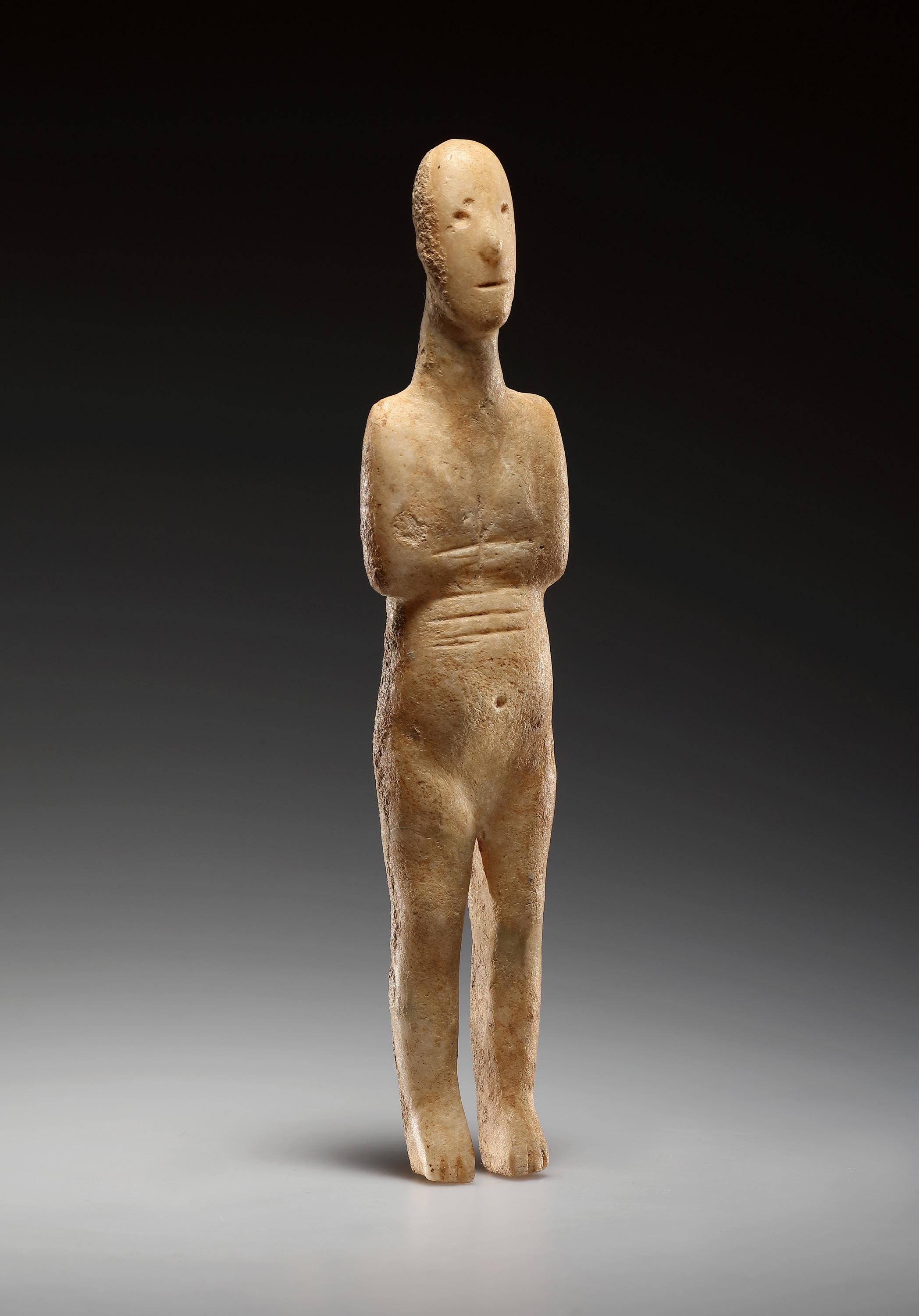 remain entirely undecorated. With its detailed rendering of the softly bulging abdomen, the navel and the genitals, this example demonstrates a careful and ambitious adaptation of the predefined shape of the bone to the human, specifically female body. Whether the noticeable swelling of the abdomen is intended to suggest pregnancy, which would imply a symbolic association with fertility, cannot be determined with certainty. Phalanx idols date to the Late Neolithic or Early Chalcolithic periods. Examples are known from the Iberian Peninsula, Eastern Europe, Anatolia, and Mesopotamia, amongst other places, and thus these idols represent a transregional phenomenon. Phalanges from hoofed animals, such as horses, were frequently used for their production. Old collection patina. A few fissures closed for stabilization. Surface slightly worn in a few places. Reverse with traces of (the original?) red paint.