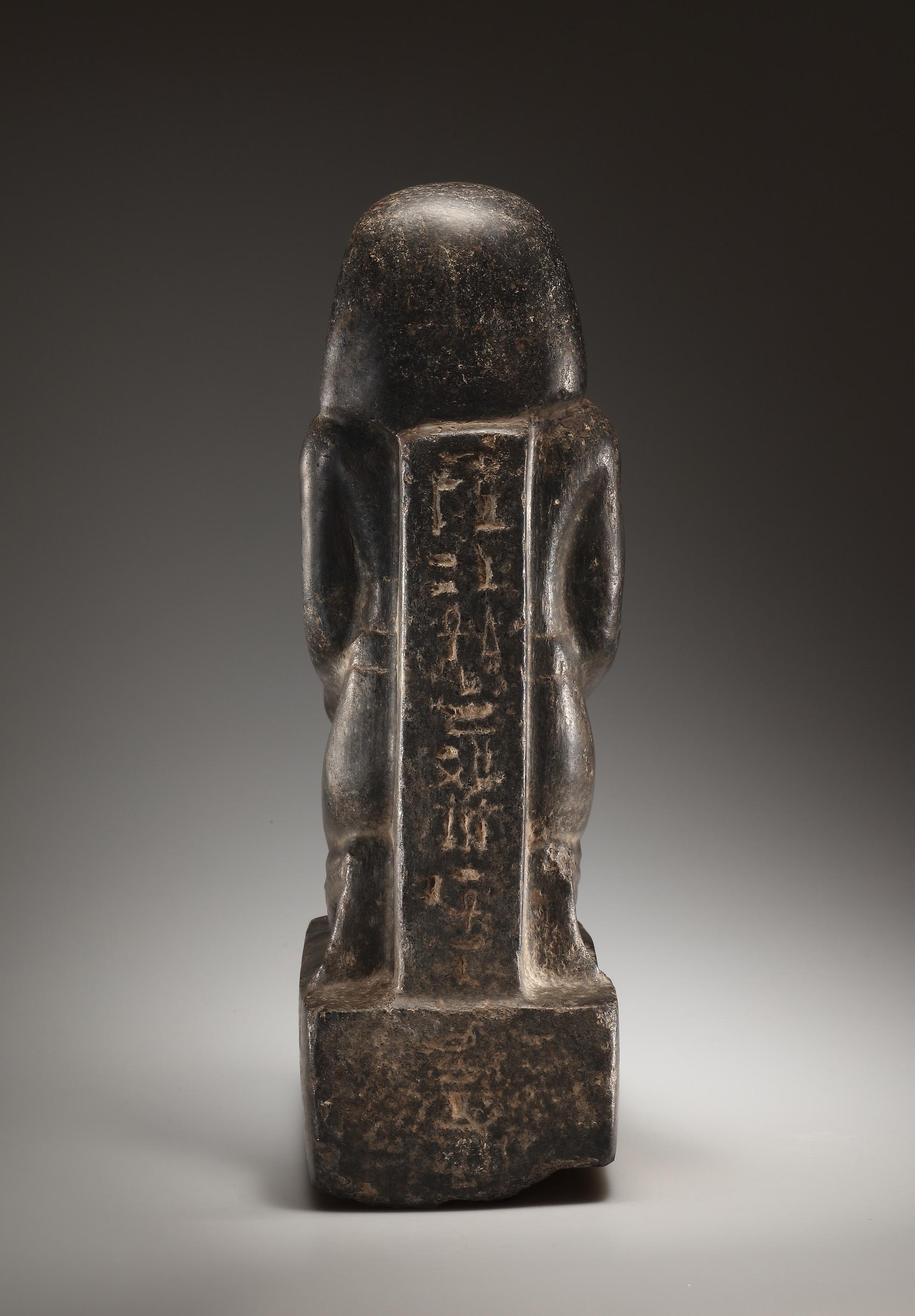 A male figure wearing a smooth kilt kneels on a rectangular base with rounded edges. He slightly raises his head that is covered by a wig. The facial features are carefully carved. The kneeling figure holds a naos containing a representation of the god Osiris. The dorsal pillar rises to the nape of the neck and is inscribed with hieroglyphs: „Osiris-Seti, may he be granted life, in every place of Neith, Chenti-Tep-Anch, so that his Ba may be glorified“ (rest not preserved). The naophoros, or naos-bearer, is a statue type that was introduced in the 18th Dynasty and was widely adopted in the Ramesside Period. Inscriptions from the Late Period explain the meaning of this image: by embracing or supporting the shrine, the donor shows that he wishes to protect to the