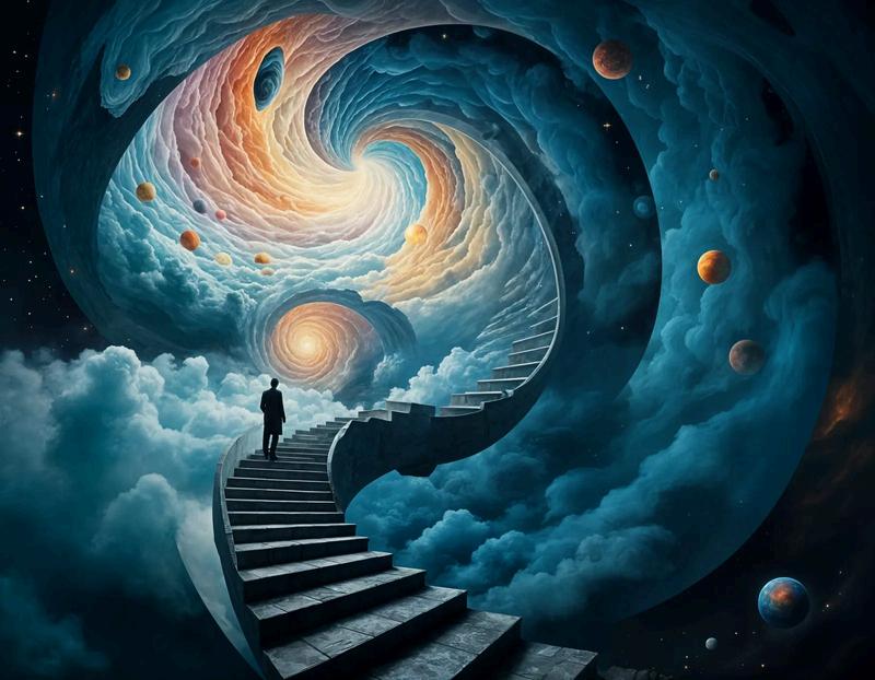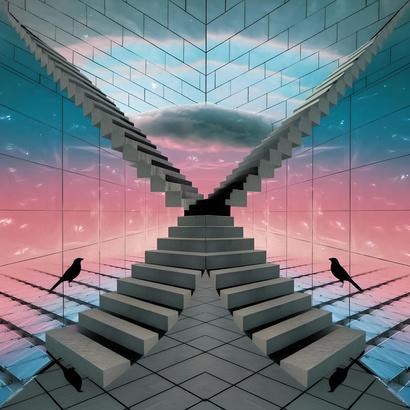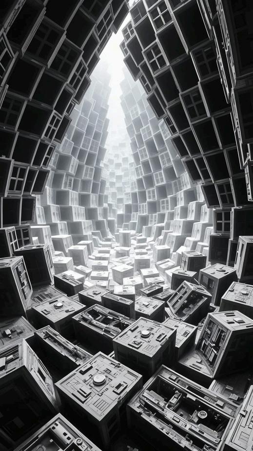 Apply "Escher-like," "impossible geometry," and "tilted angles" for mind-bending perspectives. Include "repetitive patterns" and "mirrored reflections" to mimic his visual paradoxes.