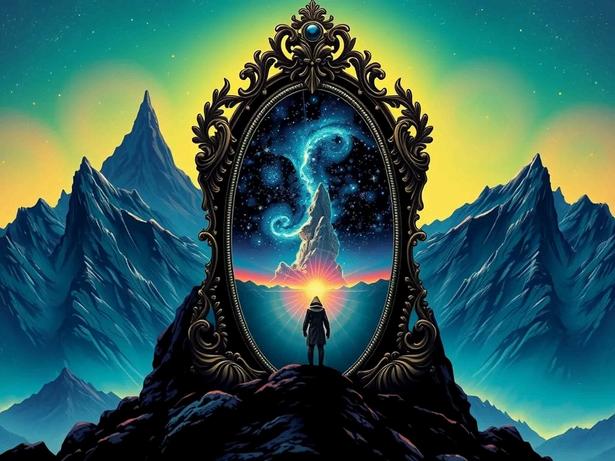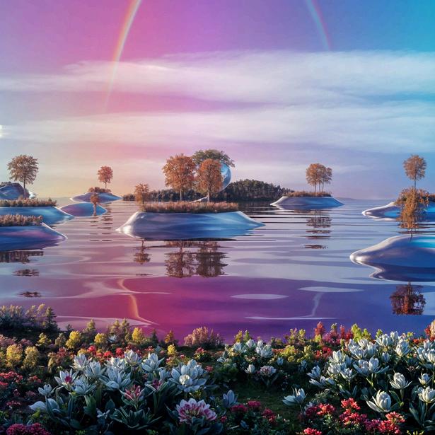 Imagine a perfectly still lake that reflects not just the sky, but an alternate reality. Use color-shifting and soft glowing light to make the reflection feel like a portal to another world.