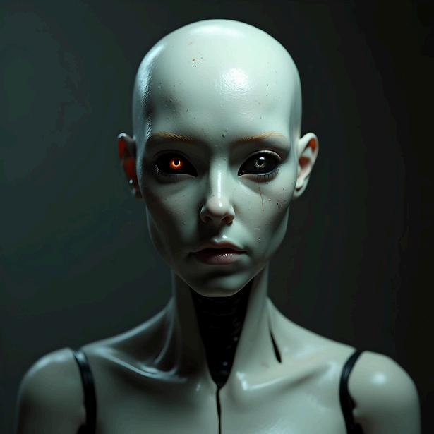 Generate a portrait of a figure that appears almost human but has subtle distortions. Experiment with features that are slightly off to create a disturbing effect.