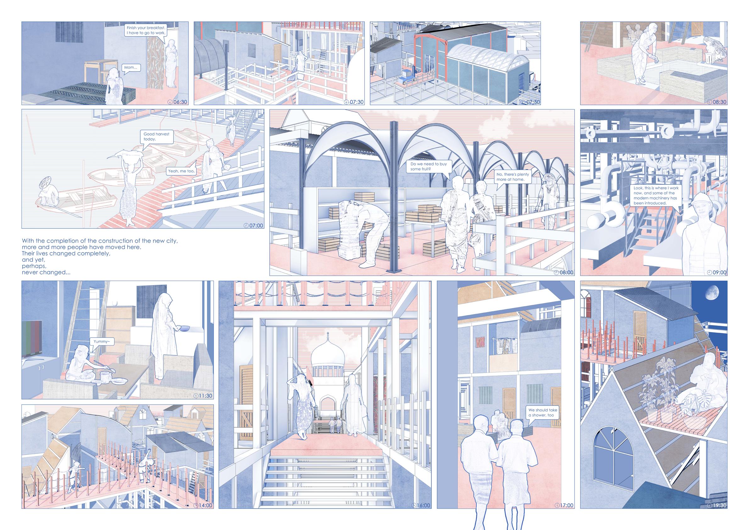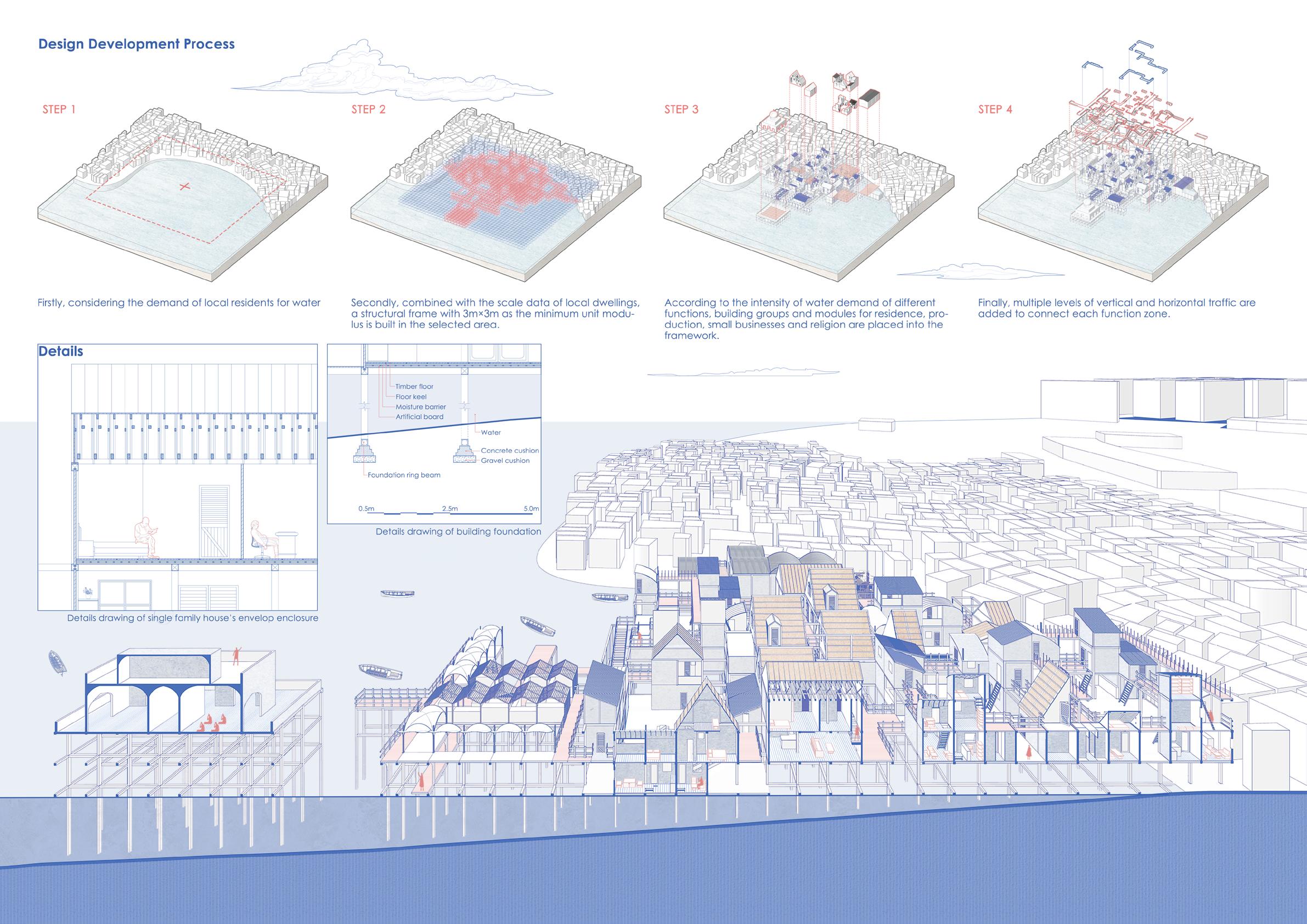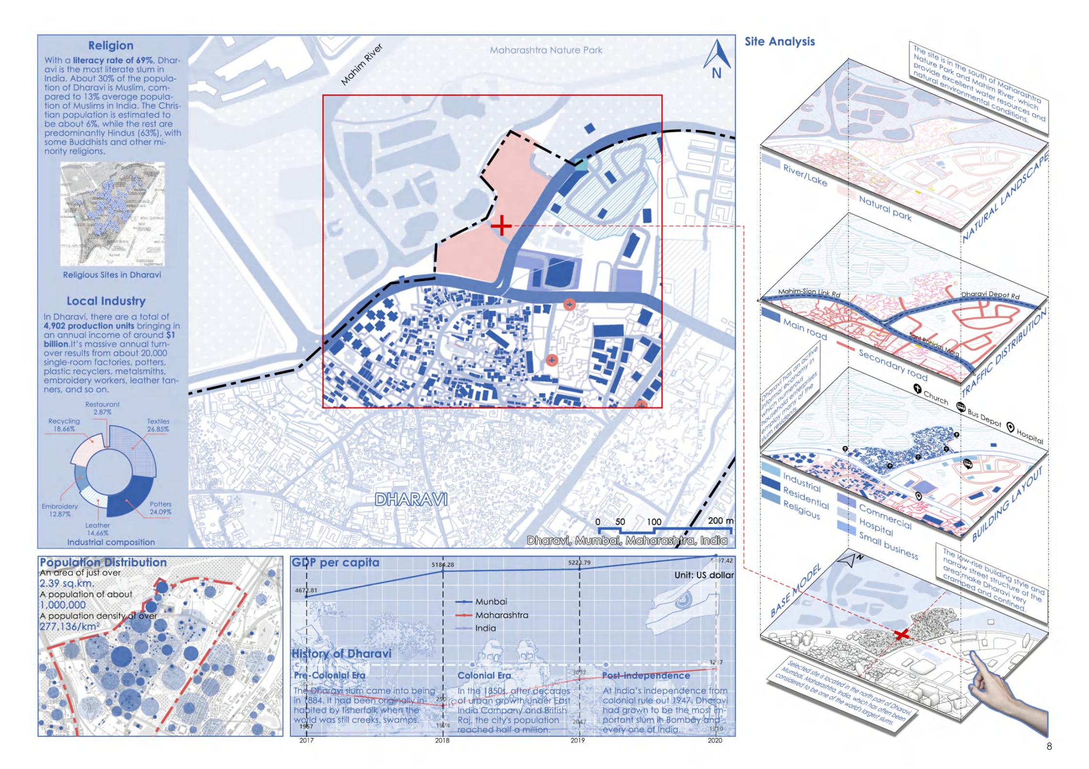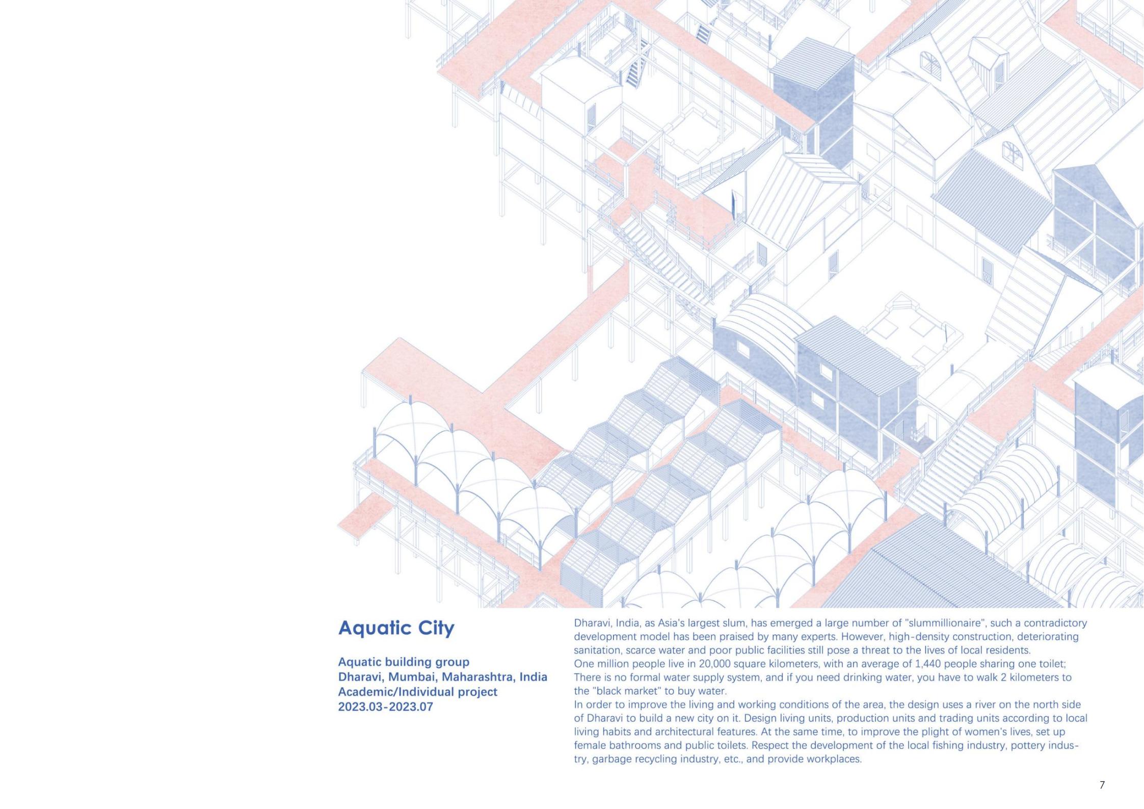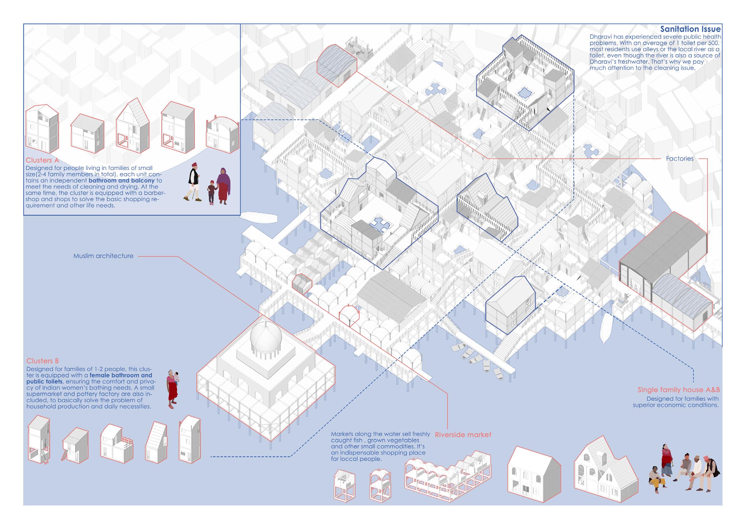 In order to improve the living and working conditions of the area, the design uses a river on the north side of Dharavi to build a new city on it. Design living units, production units and trading units according to local living habits and architectural features. At the same time, to improve the plight of women's lives, set up female bathrooms and public toilets. Respect the development of the local fishing industry, pottery industry, garbage recycling industry