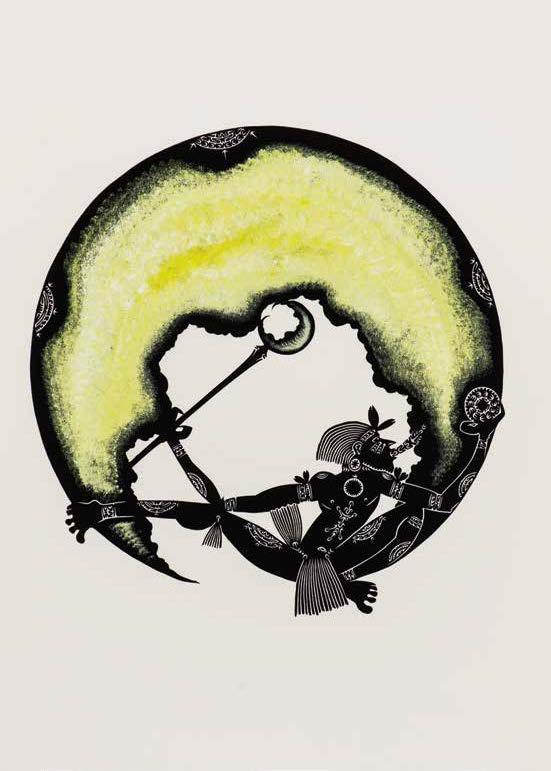 Signature pieces included in the exhibition date back to 2006, when Tipoti commenced the first of an ongoing series of largescale linocut prints that convey the cosmological scale of his subject matter. More recent artworks in the exhibition feature