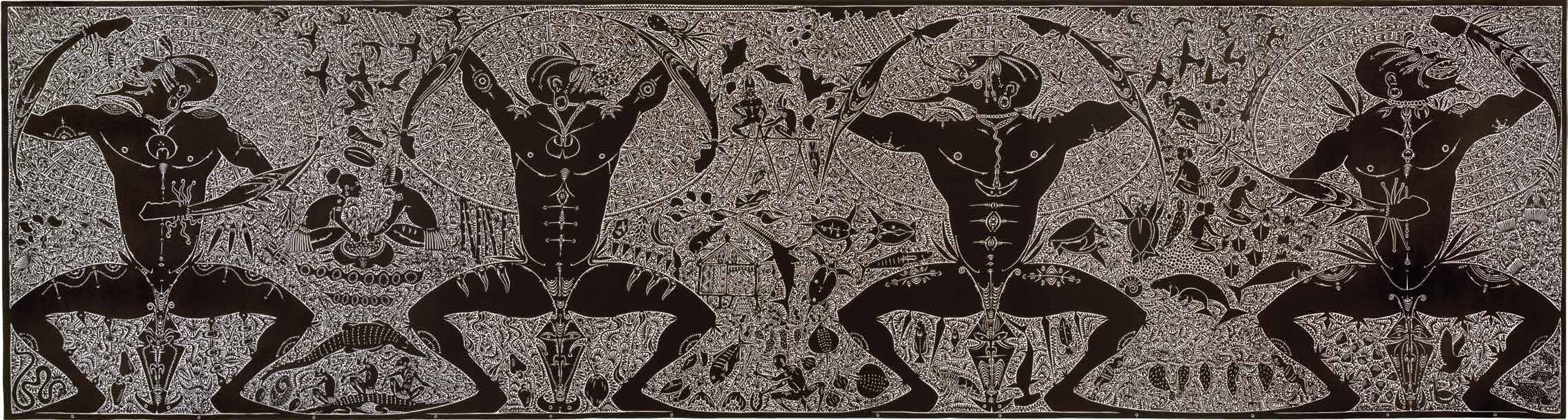 This exhibition explores how Zugubal, the spirits of Zenadh Kes ancestors, live on in the contemporary art of Alick Tipoti. Zenadh Kes refers to the Torres Strait Islands in Tipoti’s KalaLagaw Ya language and means people of the land, sea and sky. A total marine environment, or seascape, is encapsulated in a complex Zenadh Kes cosmology that supports traditional perspectives of natural, social and moral order. Tipoti draws on the creative energy of Zugubal ancestors, and walks in their footsteps, through his cultural practices of dance, chant, and visual art. Relationships between these three practices underpin this exhibition as it resonates with the synchronised rhythms of the dance, drums, chants and visual patterning.