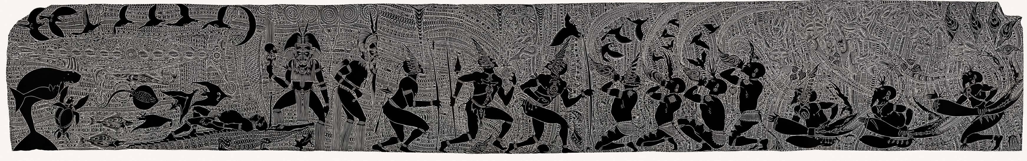 Baywa(Waterspout-turtle) 2014 single block vinyl cut in black ink printed on Hahnemuhle, handcoloured 198 x 125cm