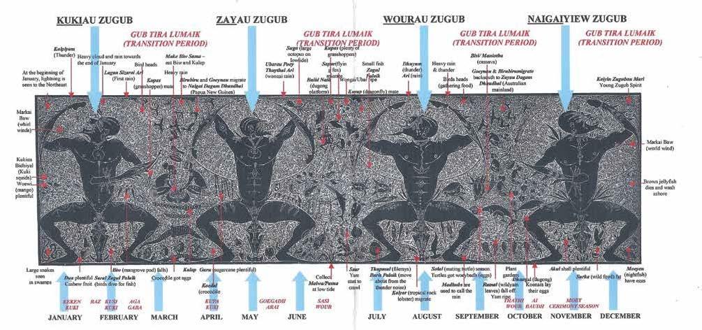 on this knowledge of nature’s rhythms. It is imperative to know the sources for fresh water, the right time of the year to hunt marine and bird life, and when to collect shells and plants used for food and medicinal purposes. Celestial navigation is necessary in plotting a course for trading expeditions with other islands, and as far afield as the Papua New Guinea coast and Cape York peninsular mainland. Contemporary art in Zenadh Kes plays a significant role in preserving this knowledge.