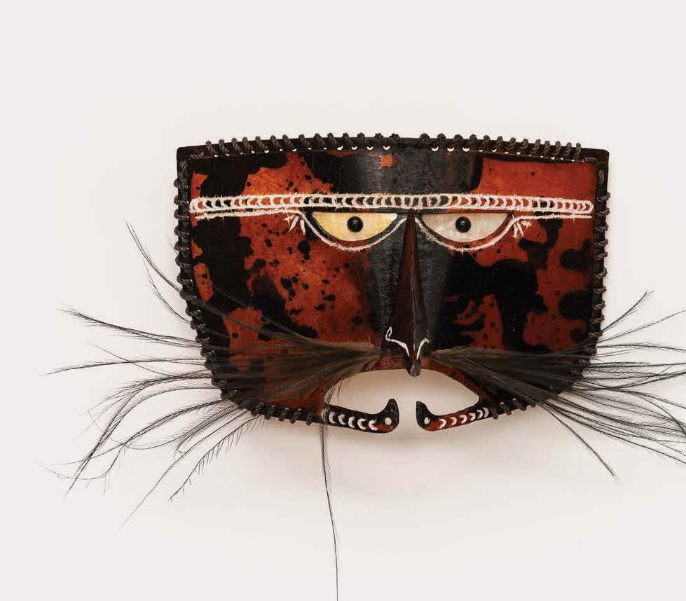 site on the south-east side of Zurath are distinctive red triangle shapes with two small downward curving lines extending from the triangle’s tip (Figure 8, Figure 9). These motifs are similar to others found at rock art sites on Pulu, yet are found more broadly on material culture objects such as decorated tobacco pipes collected from Mer and Kiwai Island at the mouth of the Fly River, as a design carved on the mouth of warup drums collected from across Zenadh Kes and south-western Papua New Guinea, and as a scarred design recorded on women at Mer in the late 1800s. Likewise, paintings of faces/masks from Badu displaying distinctive concentric circle eyes can be linked to similar rock paintings from Dauan and Mua but are also a common feature on carved wooden boards, decorated with faces, from Kiwai Island and the Papuan Gulf region (Figure 10). These similarities reveal that the distinctive triangle shape and concentric circle eyes found painted in the Badhulgal landscape are widespread design forms which reflect some form of interaction between people and objects from these locales.