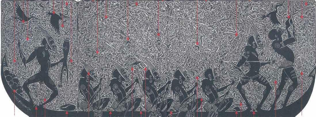 Tipoti’s visual patterning, like that of all contemporary Zenadh Kes artists, and those of the past, is densely interlocked and conveys a sensation of connectivity that is palpable. It is almost impossible to separate off any part of the image because the part is always continuous with the whole. Distinctions between background and foreground fall away as hidden figures advance from background patterns. The imagery is grounded in an essential rhythm that manifests the connectivity of all things in Zenadh Kes cosmology.