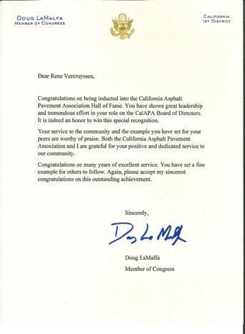 Shortly before he died unexpectedly, longtime U.S. Rep. Doug LaMalfa wrote a letter of commendation noting Rene Vercruyssen’s induction into the CalAPA Hall of Fame.