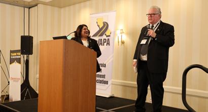 The evening kicked off with a poignant invocation delivered by longtime CalAPA member Steve Marvin with LaBelle Marvin as the association remembered those who passed away last year or could not attend this year’s dinner. Marvin talked about CalAPA as an extended family. Hall of Fame member Len Nawrocki, who served his country with distinction in the military during the Vietnam War, led the group in the Pledge of Allegiance to the Flag of the United States, which received one of the loudest cheers of the evening.