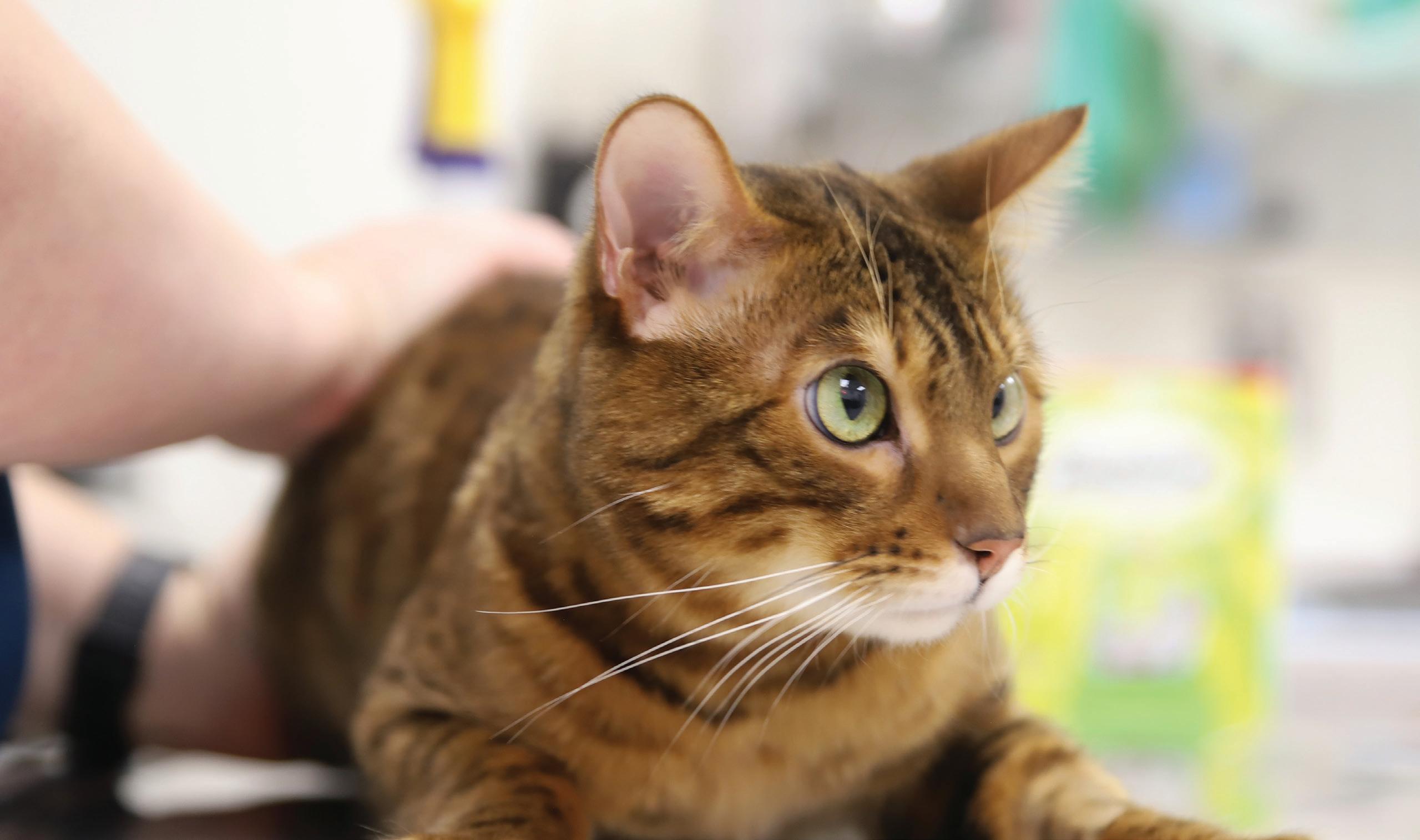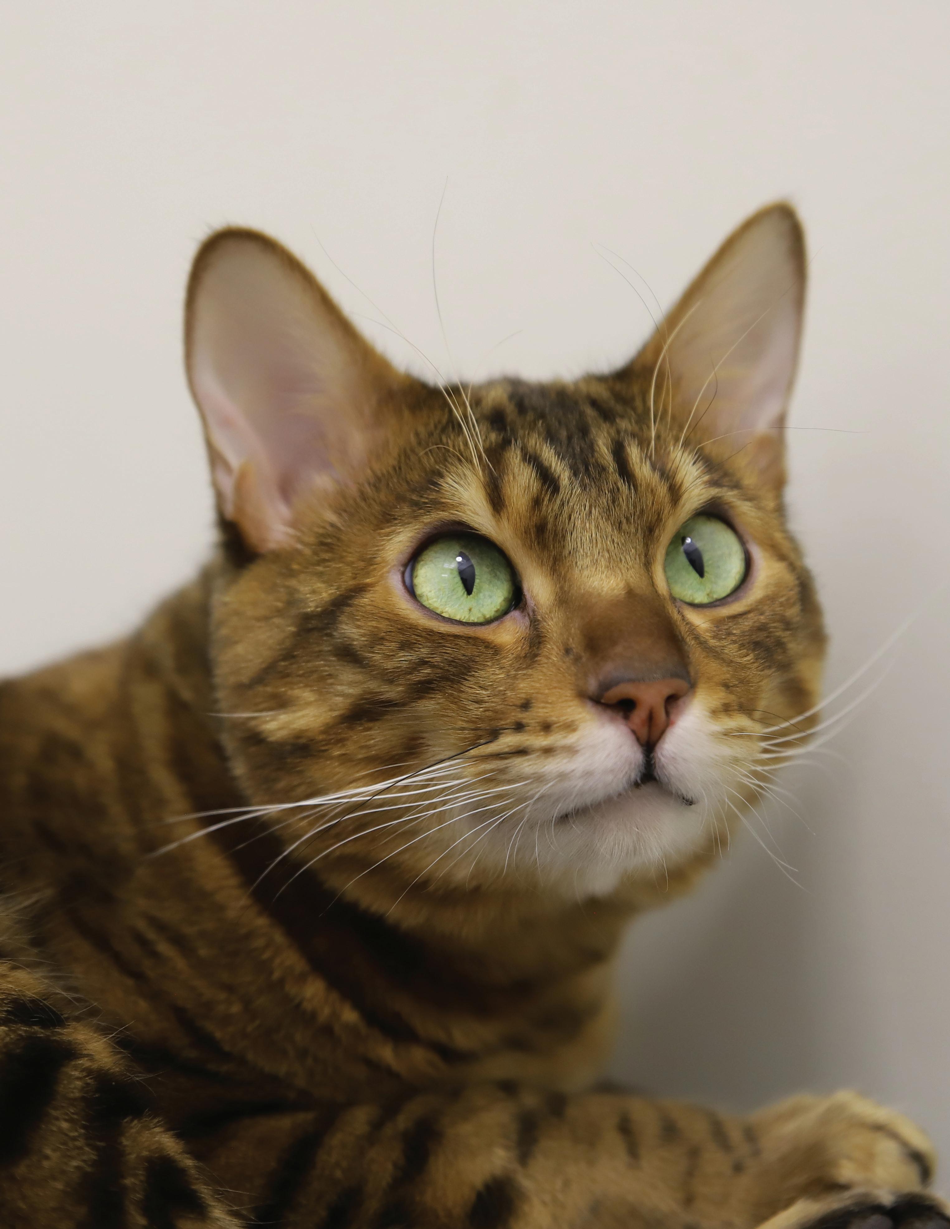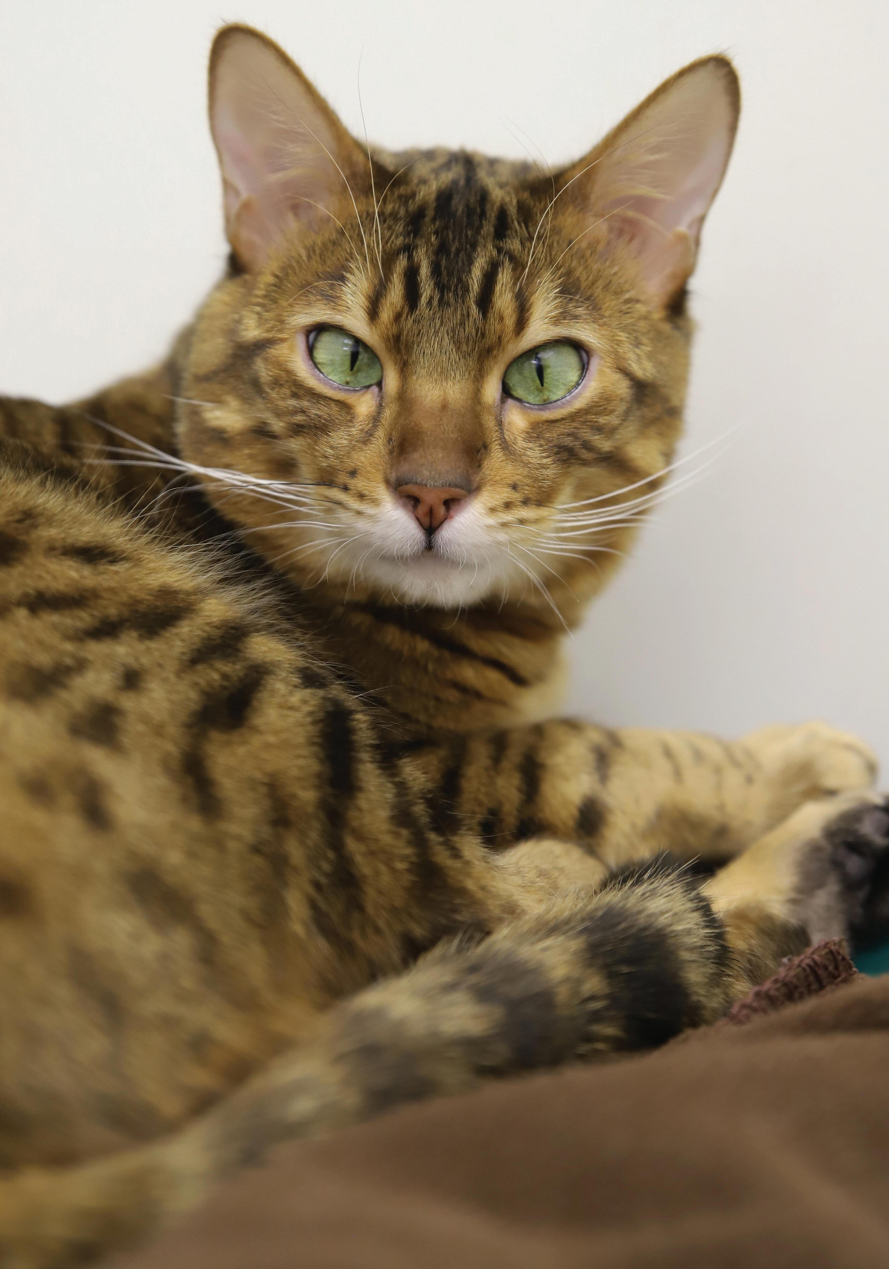 Chewy, a 3-year-old Bengal, was surrendered on September 19, 2025. The owner recently had a baby who was reported to be severely allergic to the cat. Chewy was noted by the owner to be blind, and vision impairment was confirmed on his initial examination. He was also diagnosed with a mild heart murmur and bilateral luxating patella (kneecaps).