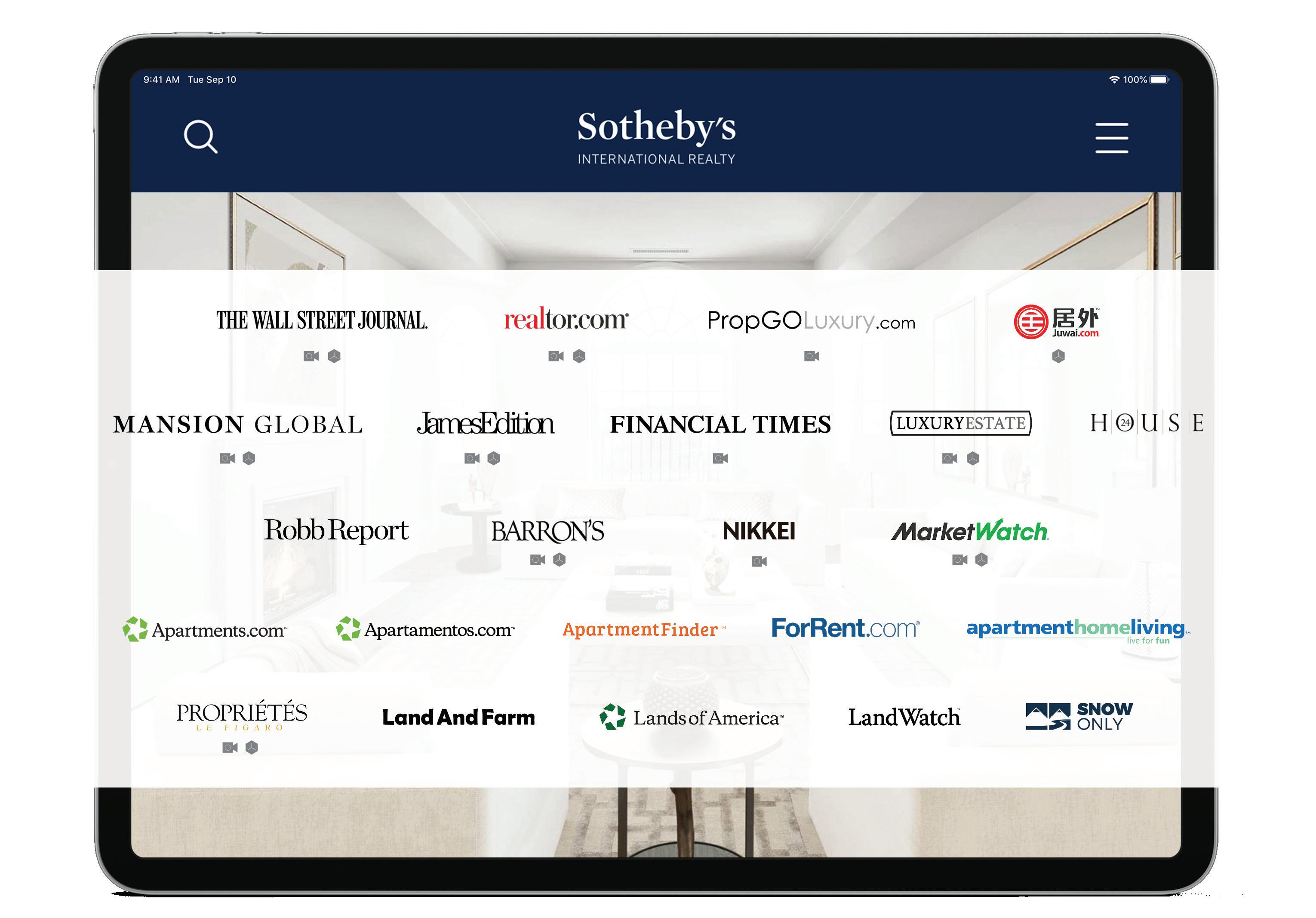 With 95% of buyers using the Internet when looking for a home, the plan to sell your property must utilize extraordinary online exposure. We leverage the Sotheby’s International Realty listing syndication platform to target the leading websites where qualified buyers search for real estate. We partner with global media powerhouses, including the most authoritative news, financial, and lifestyle voices as well as the most trusted real estate-centered websites. Some of these sites syndicate all of our listings within their own proprietary search portals; others host exclusive SIR GPS ad units that display a curated selection of geographically appropriate listings and drive traffic to sothebysrealty.com, where buyers can search according to their own parameters within the context of our brand’s award-winning website.
