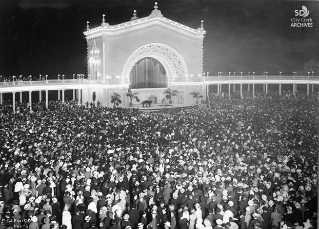 Large crowd at a nigh time event at the Spreckels Organ Pavilion. The Panama California Exposition was held in Balboa Park in San Diego between January 1, 1915, and January 1, 1917. The exposition celebrated the opening of the Panama Canal, and was meant to tout San Diego as the first U.S. port of call for ships traveling north after passing westward through the canal.
